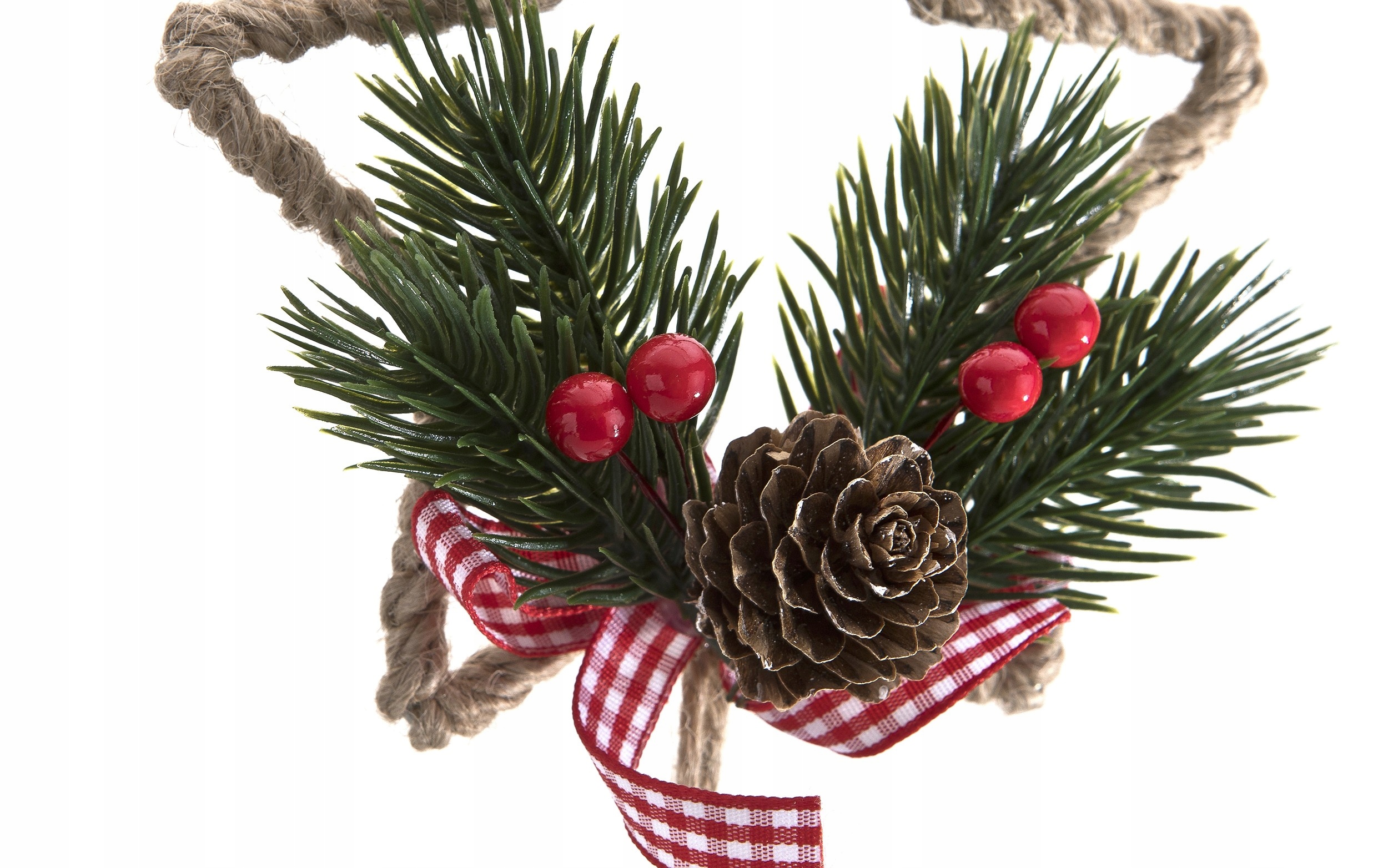 Декоративная звезда, обвитая джутовой веревкой, украшена зелеными ветками хвои, красными ягодами и сосновой шишкой, посыпанной искусственным снегом. Завершает все это клетчатый бант виши, который придает композиции уютный, домашний шарм. Три металлических колокольчика, подвешенные на веревке, мягко звенят при каждом движении, создавая утонченную праздничную атмосферу.