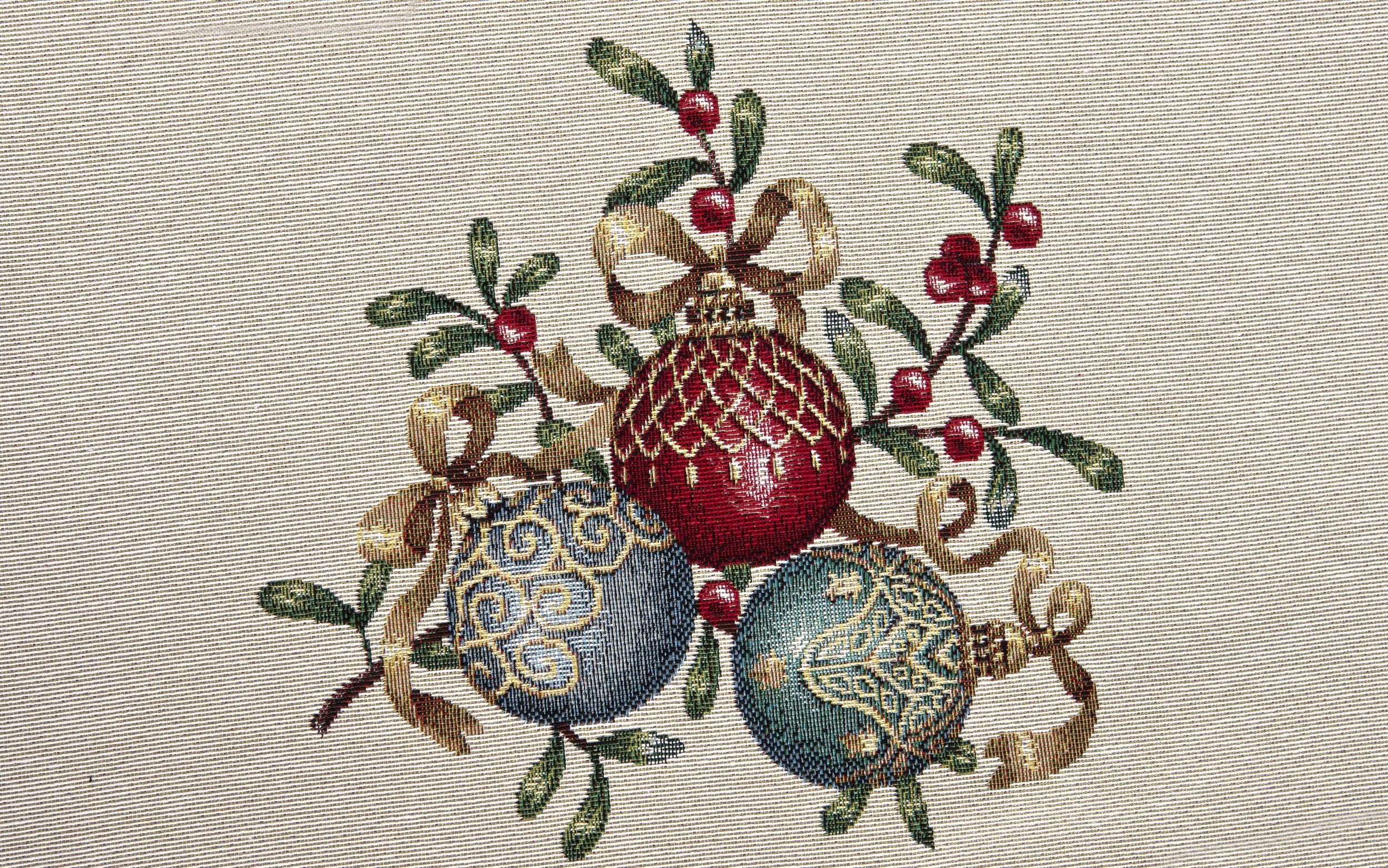На кремовом фоне выплетен эффектный узор, изображающий елочные игрушки красного, зеленого и золотого оттенков, перевитые веточками омелы и декоративными лентами. В центральной части скатерти расположены композиции из фенечек, а края украшены полосой плотно сплетенного мотива с омелой, ветвями падуба, сердечками и маленькими снежинками. Все это окружено элегантной красной окантовкой, придающей скатерти классический и праздничный вид.