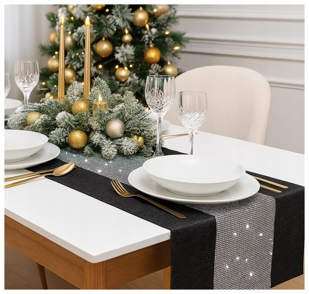 ⭐️ Серая рождественская скатерть со стразами — отличный выбор для тех, кто любит классический, элегантный вид стола во время праздников.