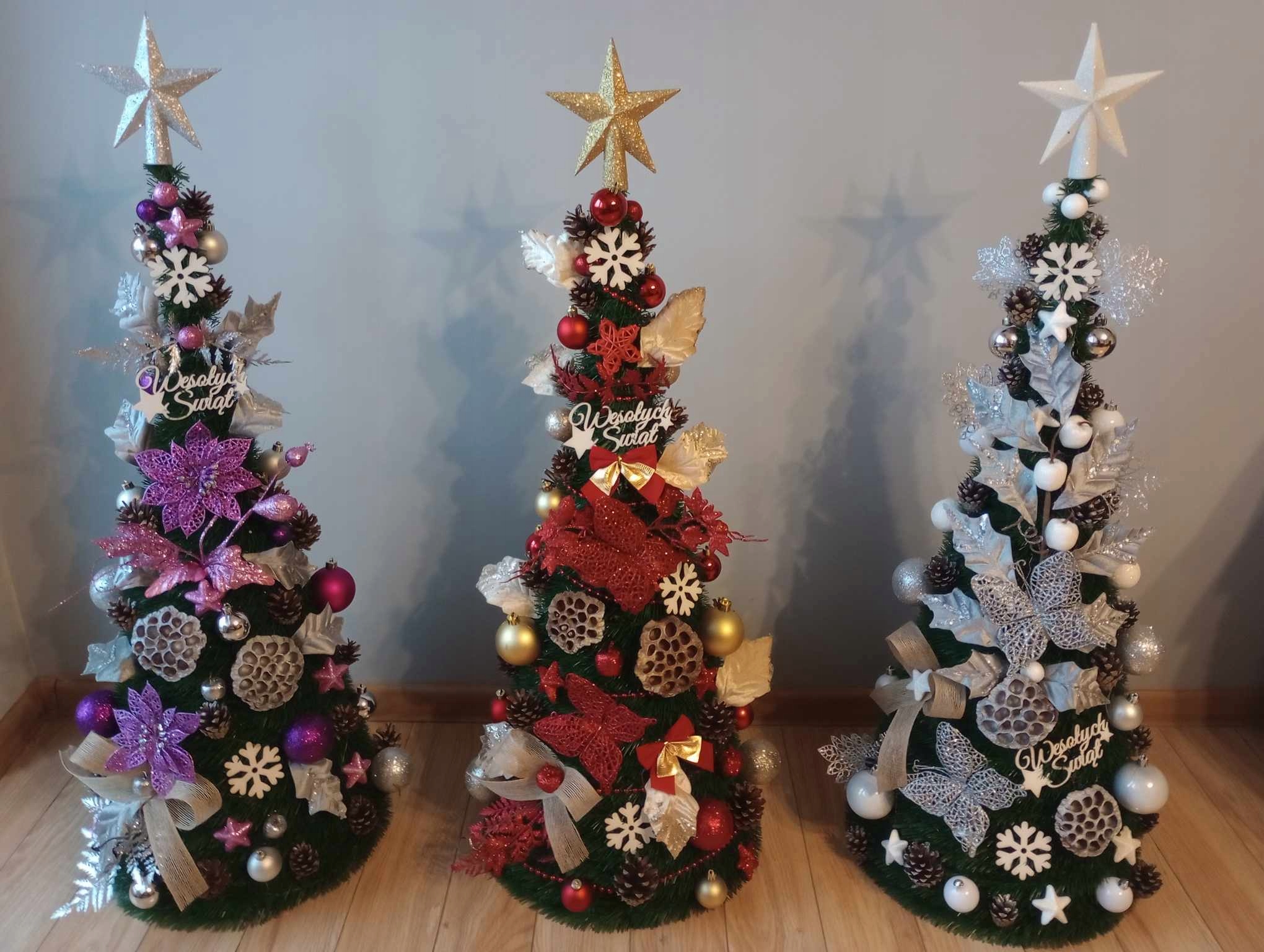 Мы изготавливаем елки с украшениями следующих цветов: серебристый, белый, золотой, синий, красный, коричневый, зеленый, фиолетовый или смешанный, например золотой. и красный.
