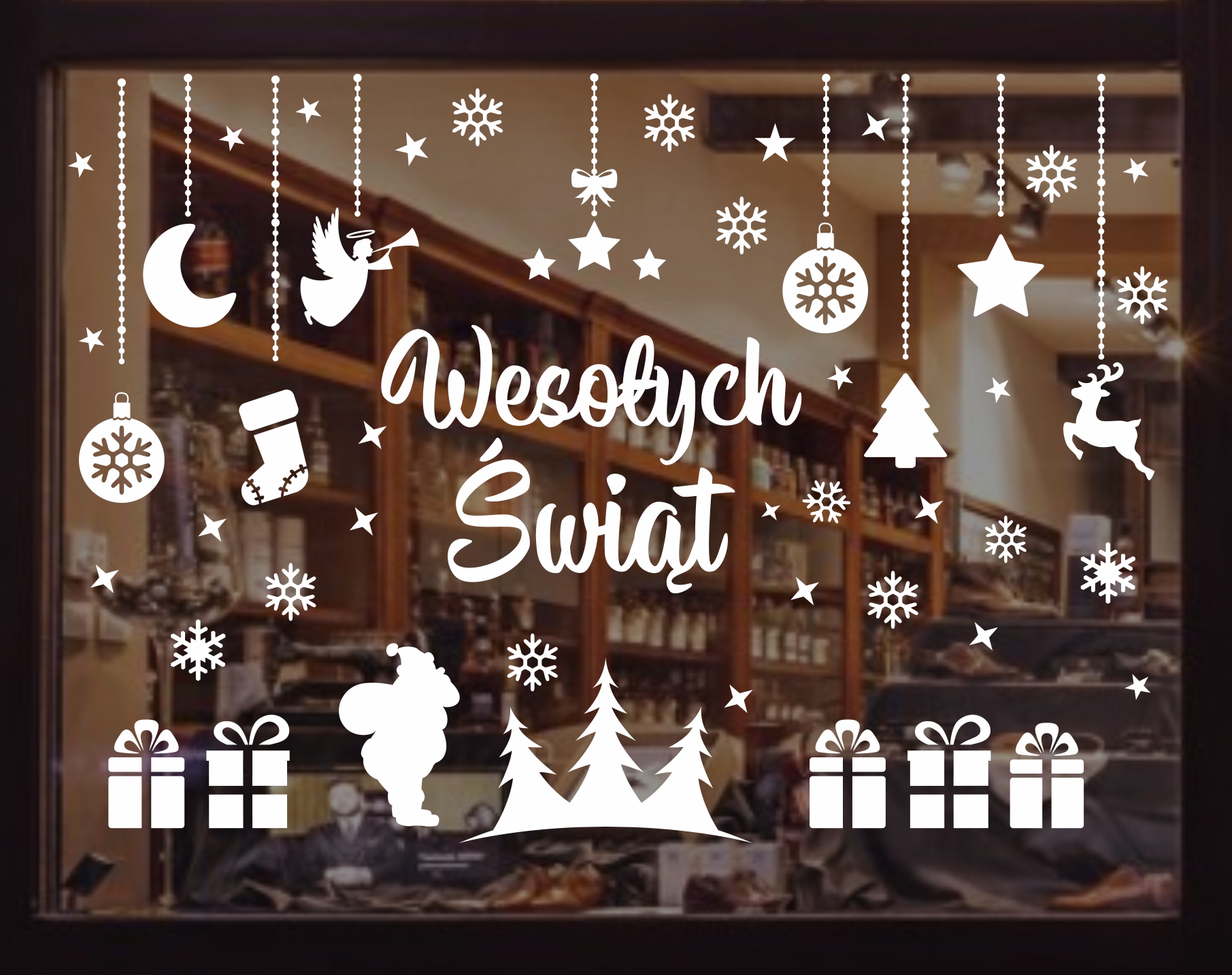Наклейки из белой матовой фольги красиво украсят окно или витрину перед Рождеством. Наклейки водонепроницаемы и их можно приклеивать на все плоские поверхности (например, зеркало, мебель, стену, окно).