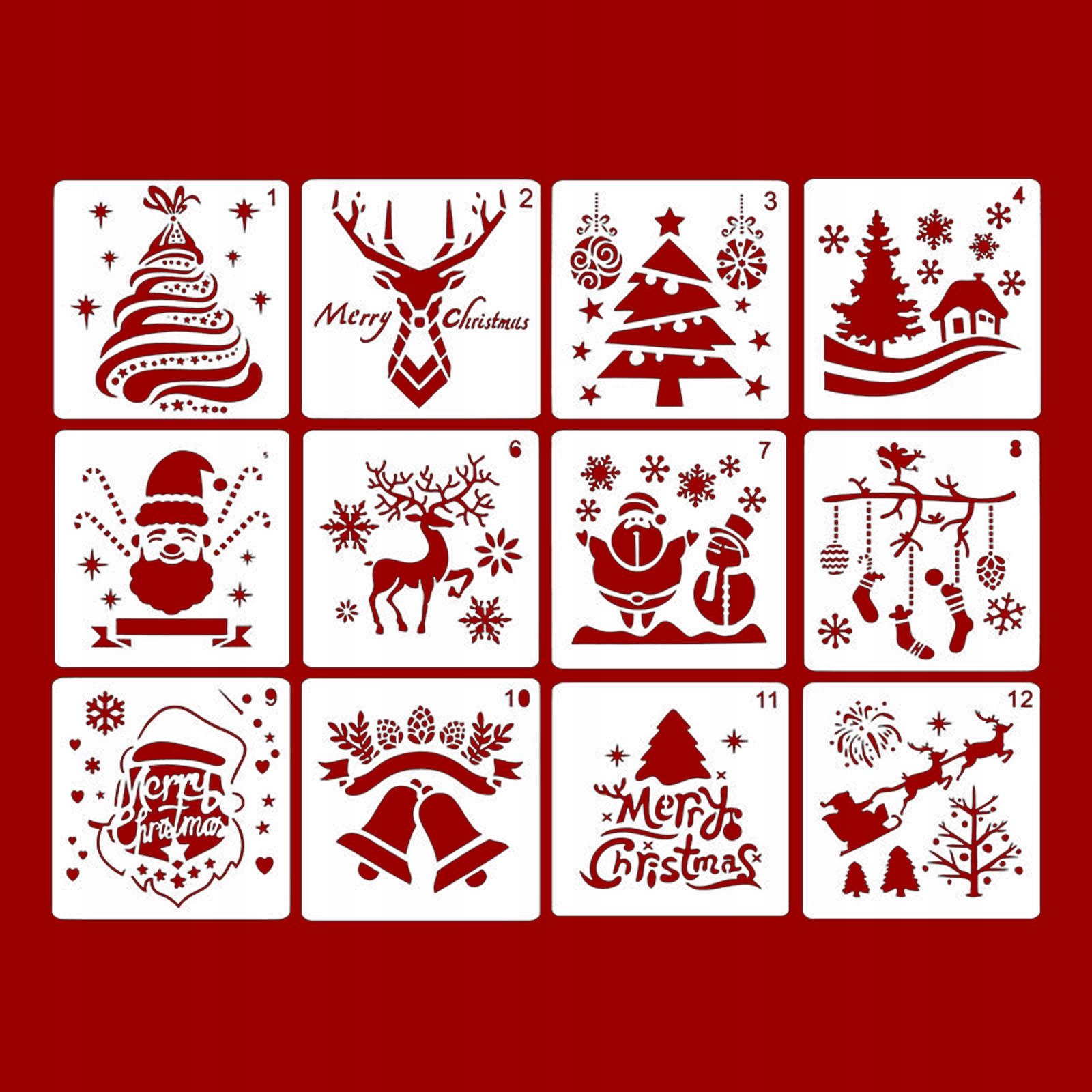 Набор из 12 трафаретов на рождественскую тему, включая рождественские колокольчики с изображением Санта-Снеговика, снежного лося, рождественские чулки и т. д.