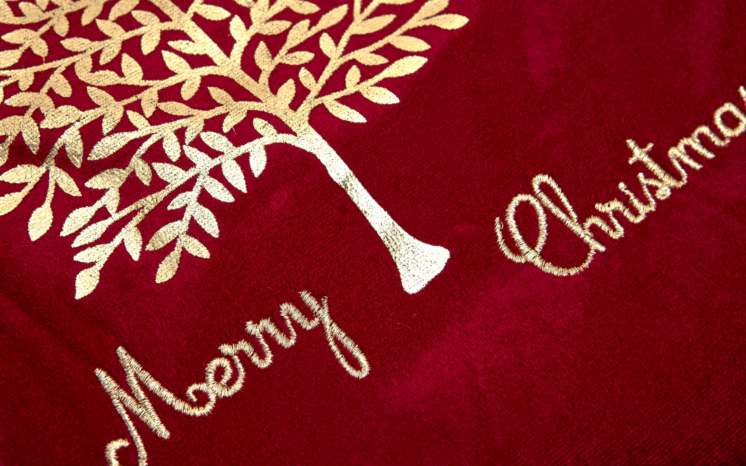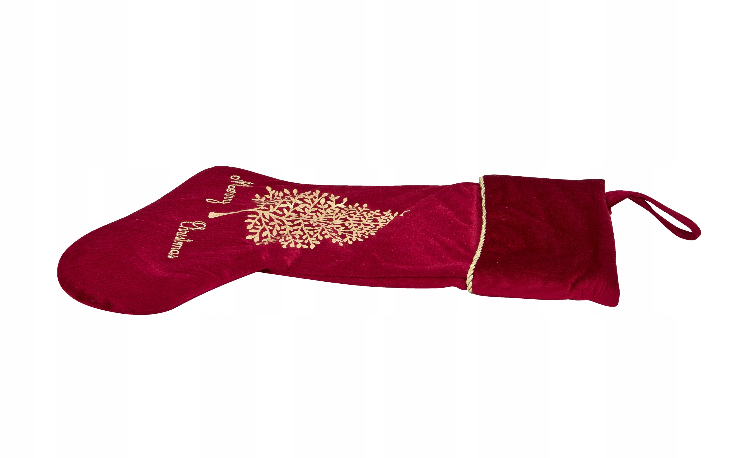 Очаровательный рождественский чулок для подарков из приятной бархатной ткани красного цвета. Он украшен золотой аппликацией в виде елочки и надписью Merry Christmas. Носок с одной стороны имеет рисунок, другая гладкая.