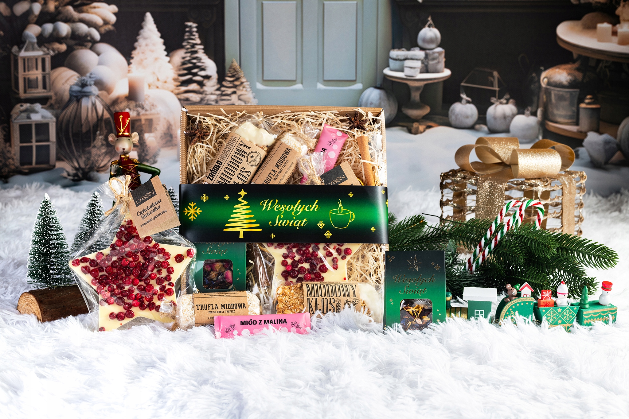 Рождественский подарочный набор, состоящий из фруктового чая, медового трюфеля, медовой уха, меда с малиной и шоколадной звезды!