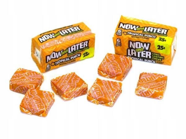 Now and Later — растворимая фруктовая жевательная резинка. И, как следует из названия, ваши зубы будут работать постоянно (мы вам это обещаем!). В упаковке содержится 6 штук жевательной резинки с тропическим вкусом. Каждый кусочек наполнен блаженным фруктовым вкусом и уникальной жевательной текстурой. Попробовав его, вы сможете насладиться долгим вкусом жвачки. :)