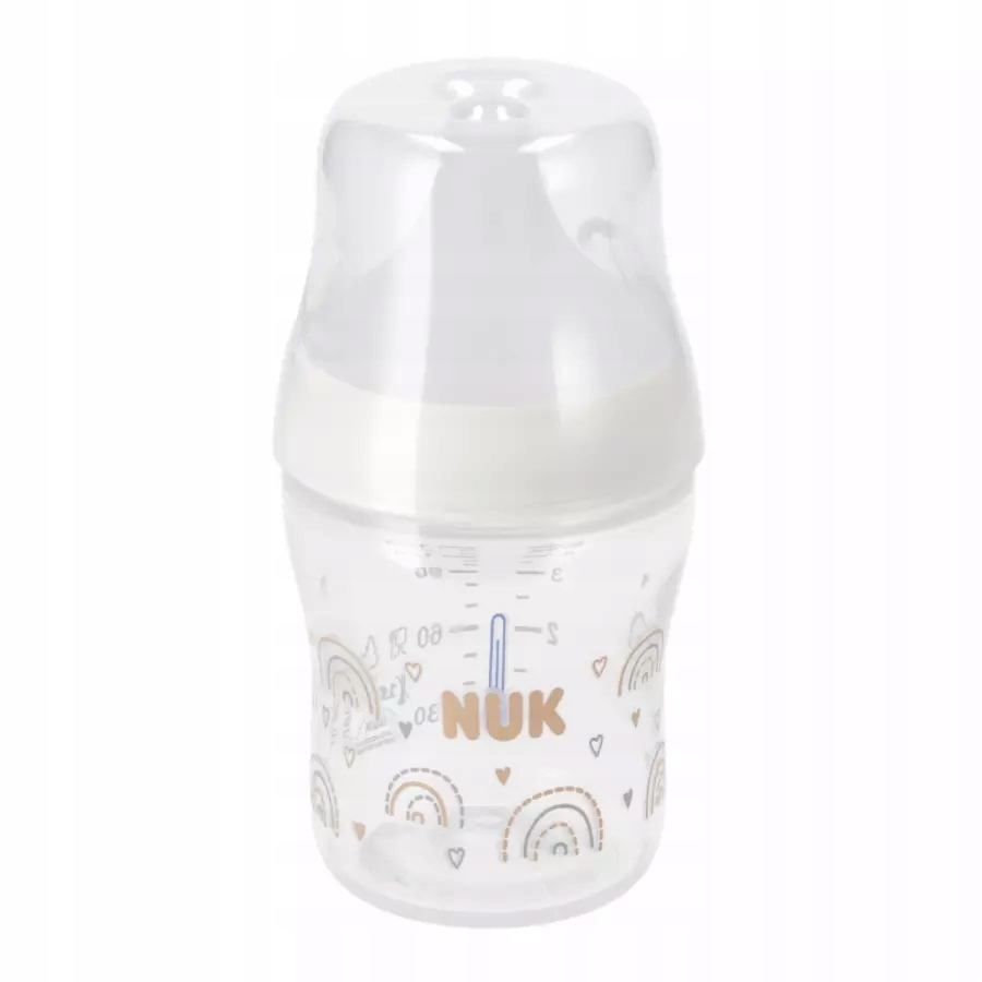 Чтобы убедиться, что вводя пищу не будет слишком горячей, бутылка NUK имеет индикатор температуры NUK. Индикатор выглядит как термометр и расположен между линиями шкалы. Индикатор изменяет цвет под влиянием изменения температуры содержания бутылки.
