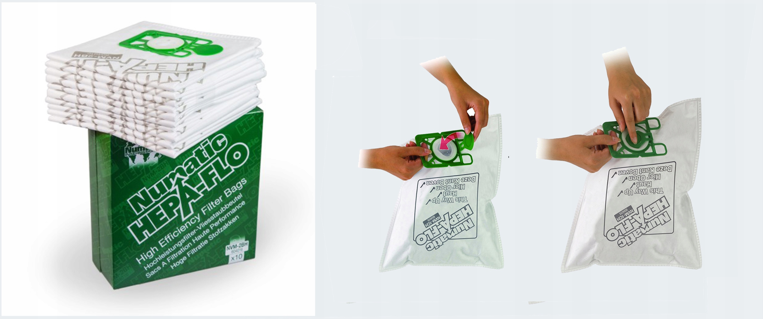 Оригинальные пакеты Hepa-Flo®, запатентованные компанией Numatic, изготовлены из многослойного фильтрующего нетканого материала с гигиенической системой закрытия. Конструкция мешка означает, что пылесос не теряет мощности всасывания по мере наполнения (как в случае с бумажным мешком), потребляет меньше электроэнергии и оставляет более чистый воздух!