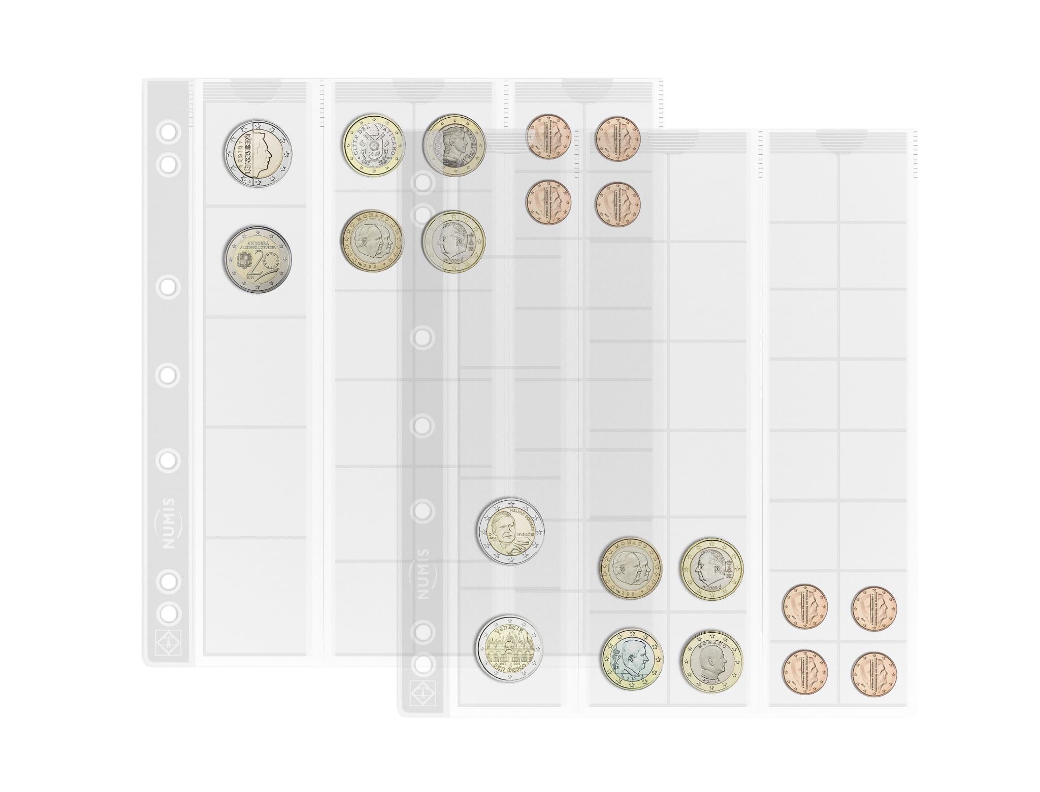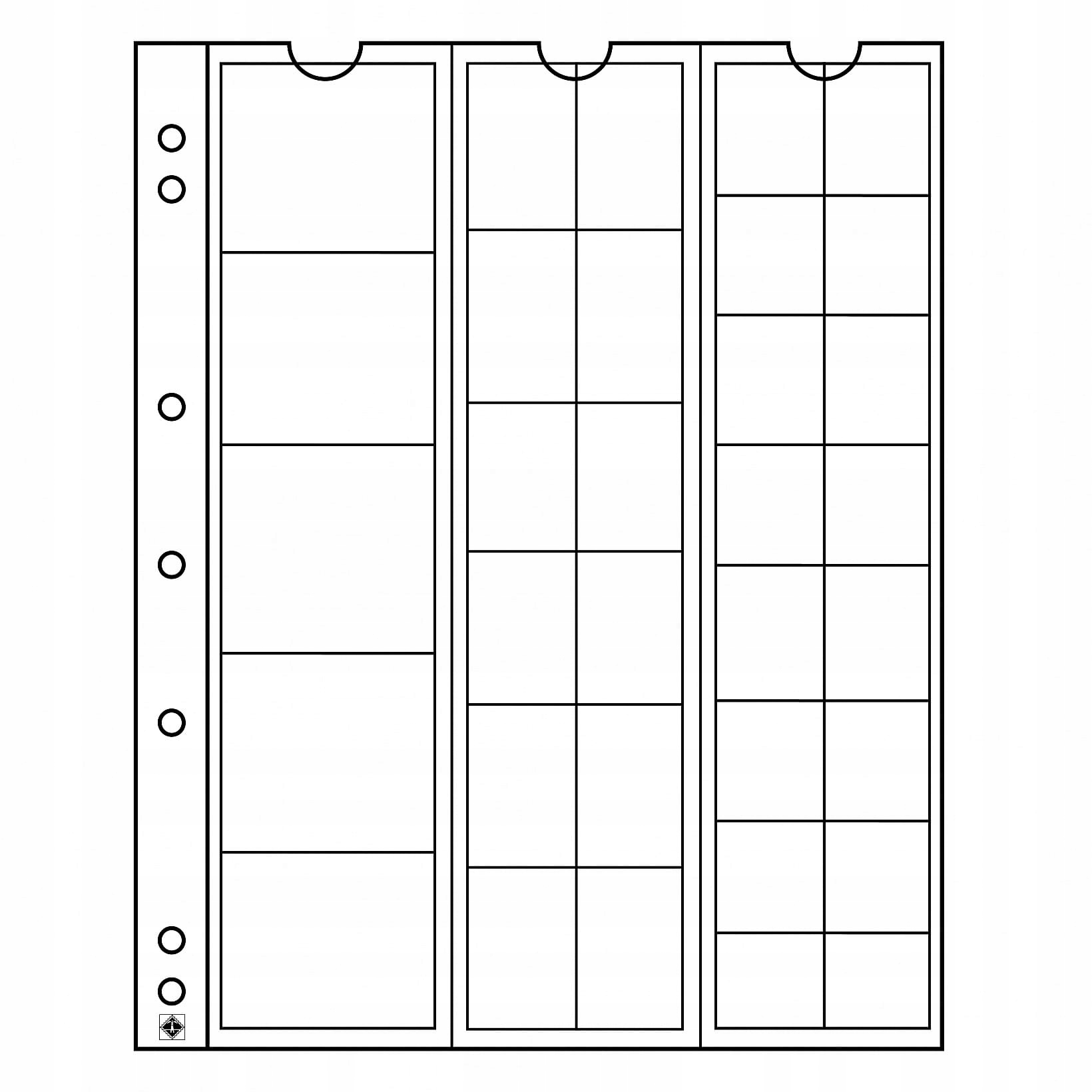 - каждая карточка разделена на 3 части (полоски) и дает место для 33 монет. Монеты размещаются в полосках, которые скользят вверх. Полосы имеют: 5 окон для монет диаметром до 34 мм, 12 окон для монет диаметром до 25 мм и 16 окон для монет диаметром до 17 мм,