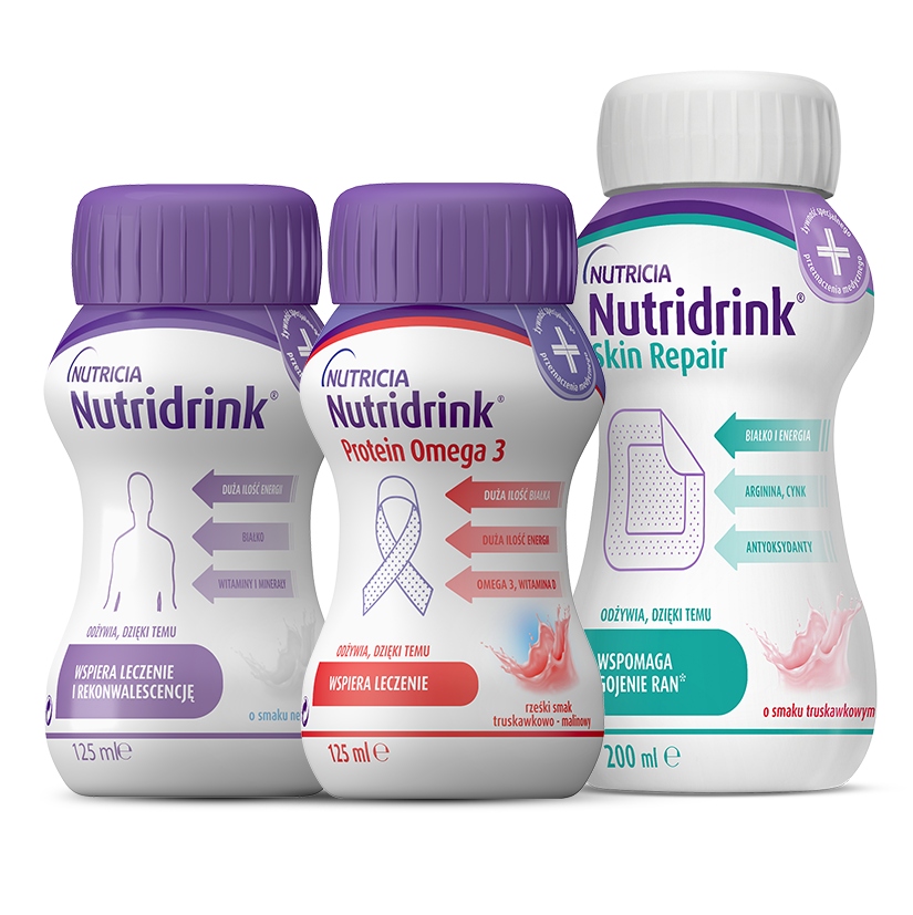 Nutridrink Protein, Nutridrink, Nutridrink Protein Omega 3, Nutridrink Skin Repair - продукты питания специального медицинского назначения. Используйте под медицинским наблюдением. Nutridrink Protein для диетического контроля недостаточности питания и риска недостаточности питания, связанного с заболеванием, особенно у пациентов с повышенной потребностью в белке. Нутридринк для диетического лечения недостаточности питания и риска недостаточности питания, связанного с этим заболеванием. Nutridrink Protein Omega 3 для диетического лечения онкологических больных с недостаточностью питания или связанного с ней риска недостаточности питания. Nutridrink Skin Repair для диетического лечения пролежней и других труднозаживающих ран.