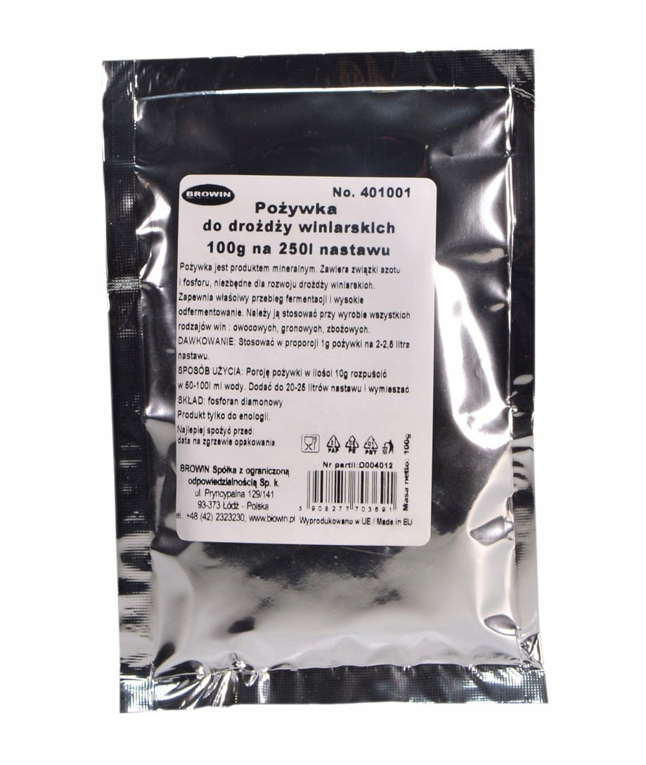 Питательное вещество представляет собой минеральный продукт. Содержит соединения азота и фосфора, необходимые для развития винных дрожжей. Это обеспечивает правильную ферментацию и высокую аттенюацию. Его следует использовать при производстве всех видов вин: фруктовых, виноградных, зерновых...