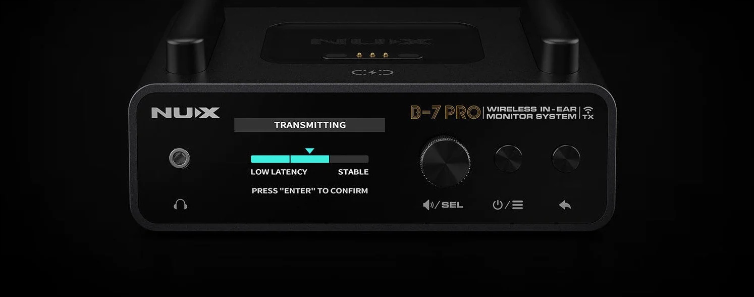 NUX B-7 PRO — это персональная беспроводная внутриушная система мониторинга с автоматической настройкой, помехозащищенной частотой передачи 2,4 ГГц и высококачественным стереозвуком 24 бит/48 кГц. Радиус действия составляет до 50 метров, а беспроводная передача характеризуется очень низкой задержкой.