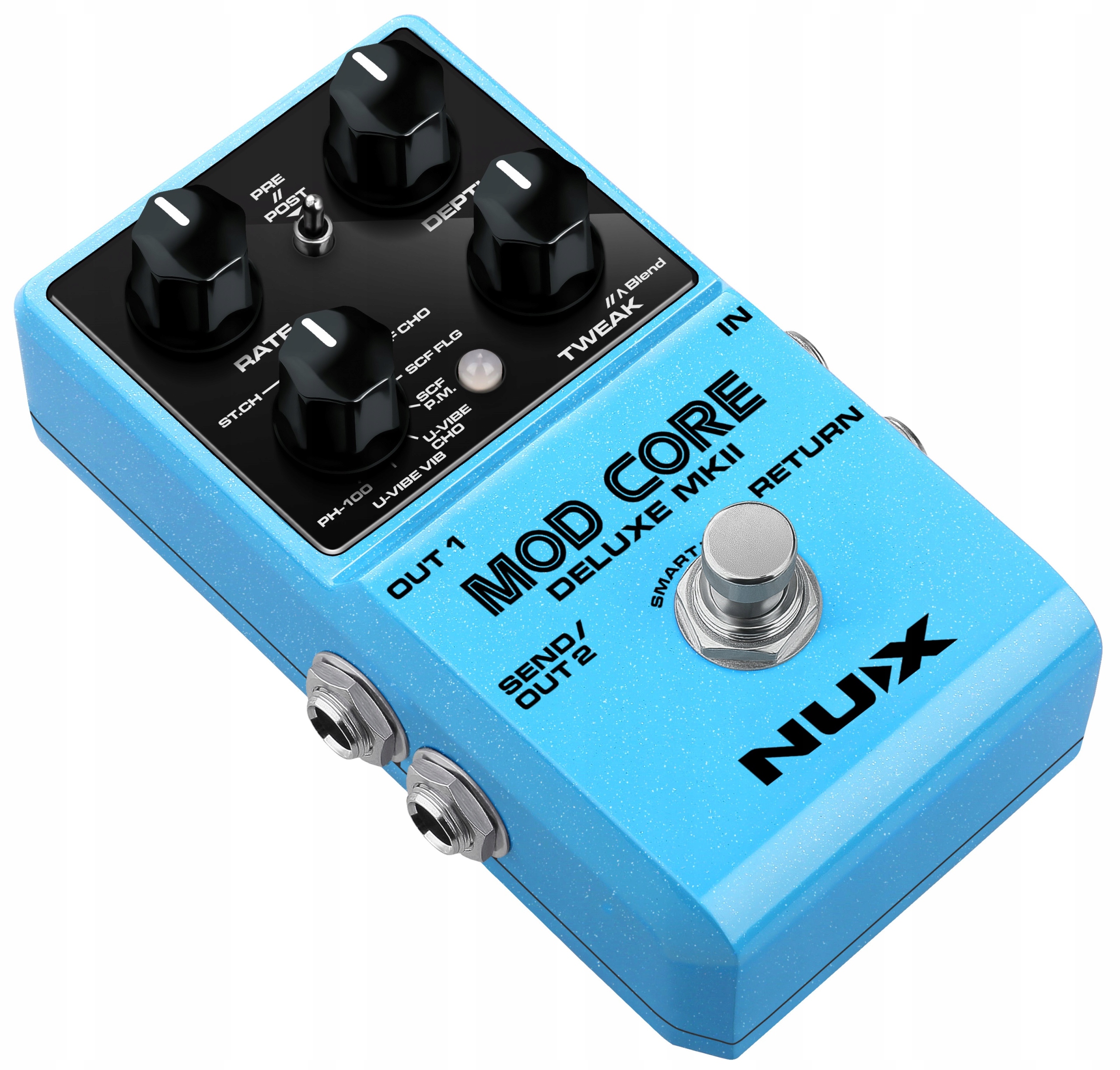 nux mod core deluxe mkii-это эффект модуляции с 8 различными режимами, включая St.ch (Stereo Chorus), CE-1, SCF CHO, SCF FLG, SCF P.M., U-Vibe CHO, U-Vibe VIB и PH-100. Вы можете переключить типы эффектов, используя вращающийся переключатель типа .