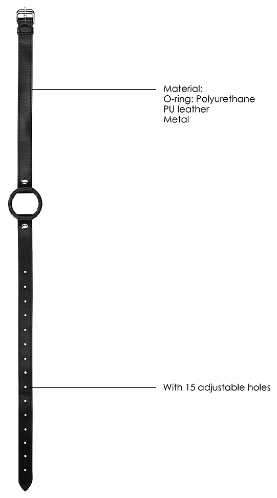 Ремешок (также изготовленный из прочного полиуретана) полностью регулируется и имеет застежка-кнопка одного из 15 отверстий позволяет использовать его ко всем сабвуферам и сабвуферам. Круглое кольцо имеет внутренний диаметр 3,2 см (1,3 дюйма) и располагается за зубами, оставляя рот и челюсть соблазнительно открытыми. Ремешок, включая кольцо, имеет общую длину 67,5 см (27 дюймов) и ширину 4,4 см (1,8 дюйма).