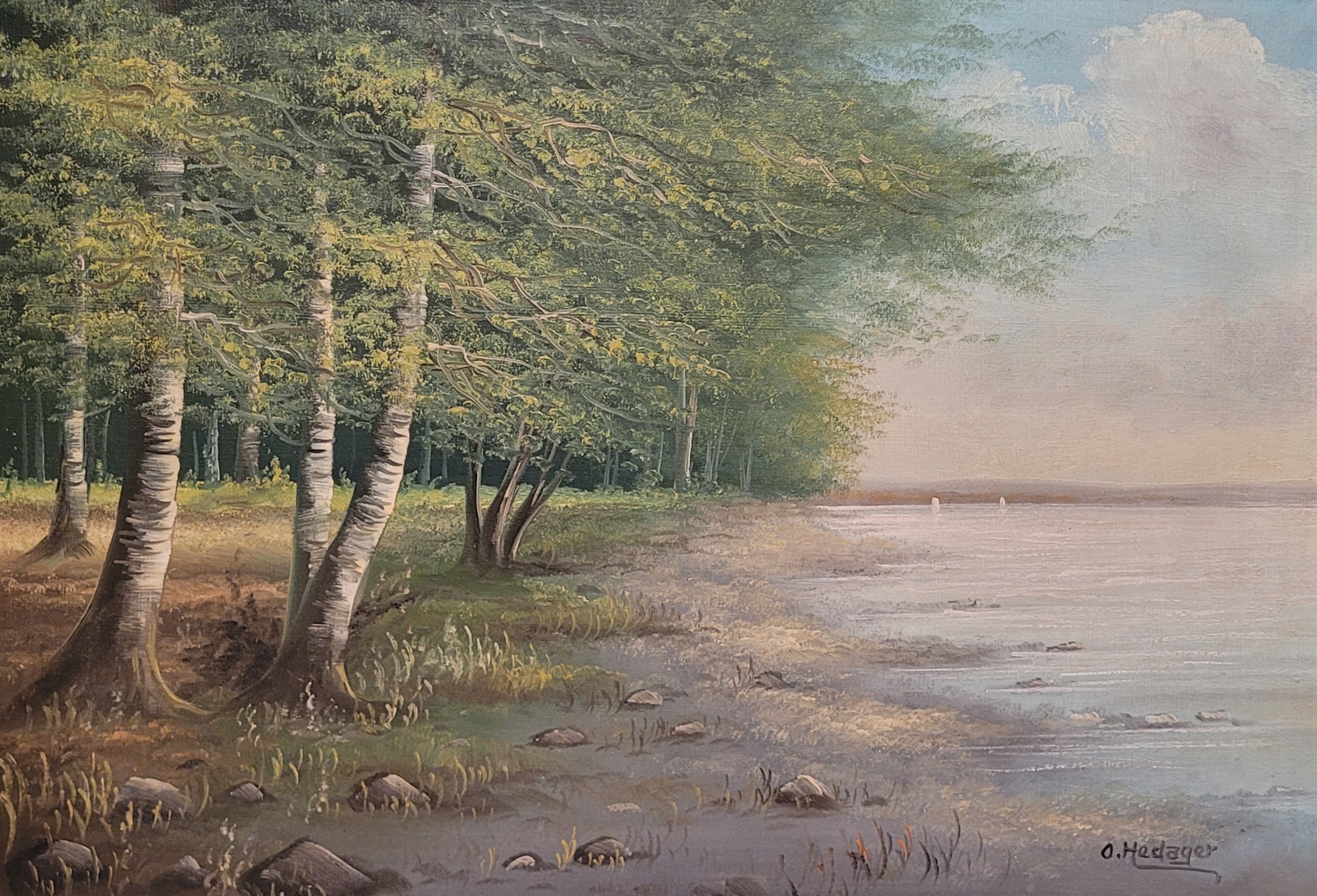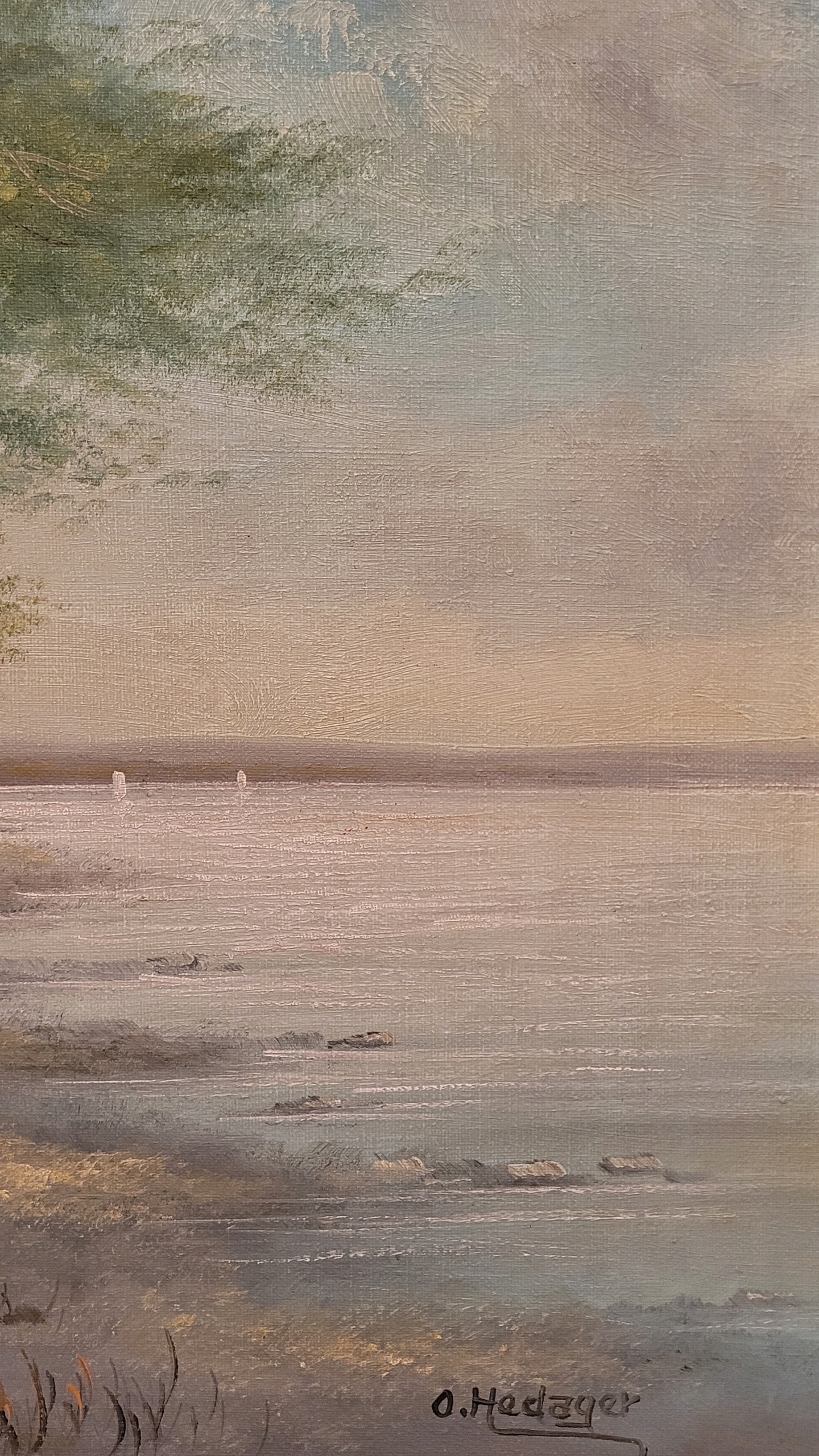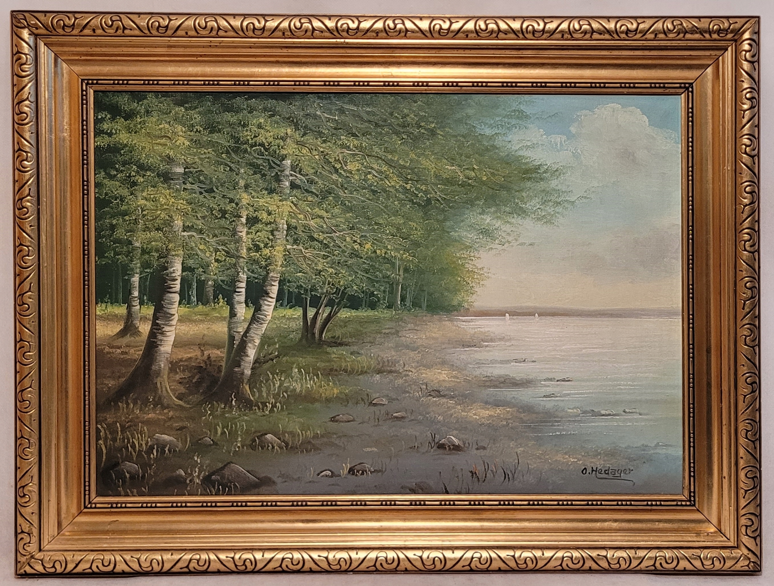 О.ГЕДАГЕР - "ПЕЙЗАЖ З ОЗЕРОМ", стара олійна картина.