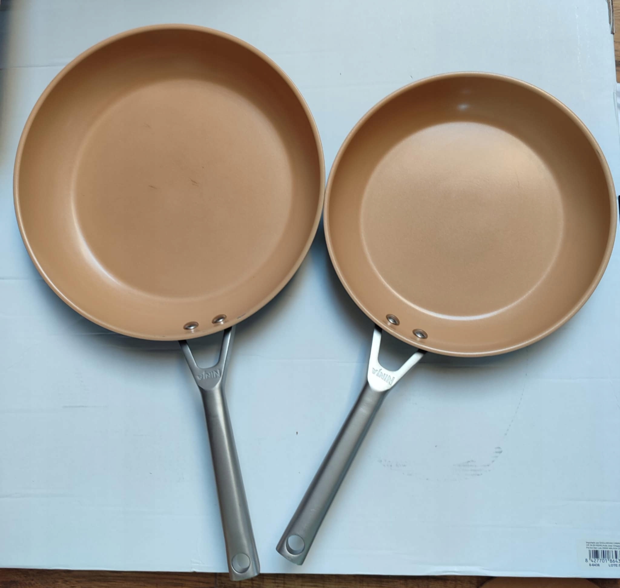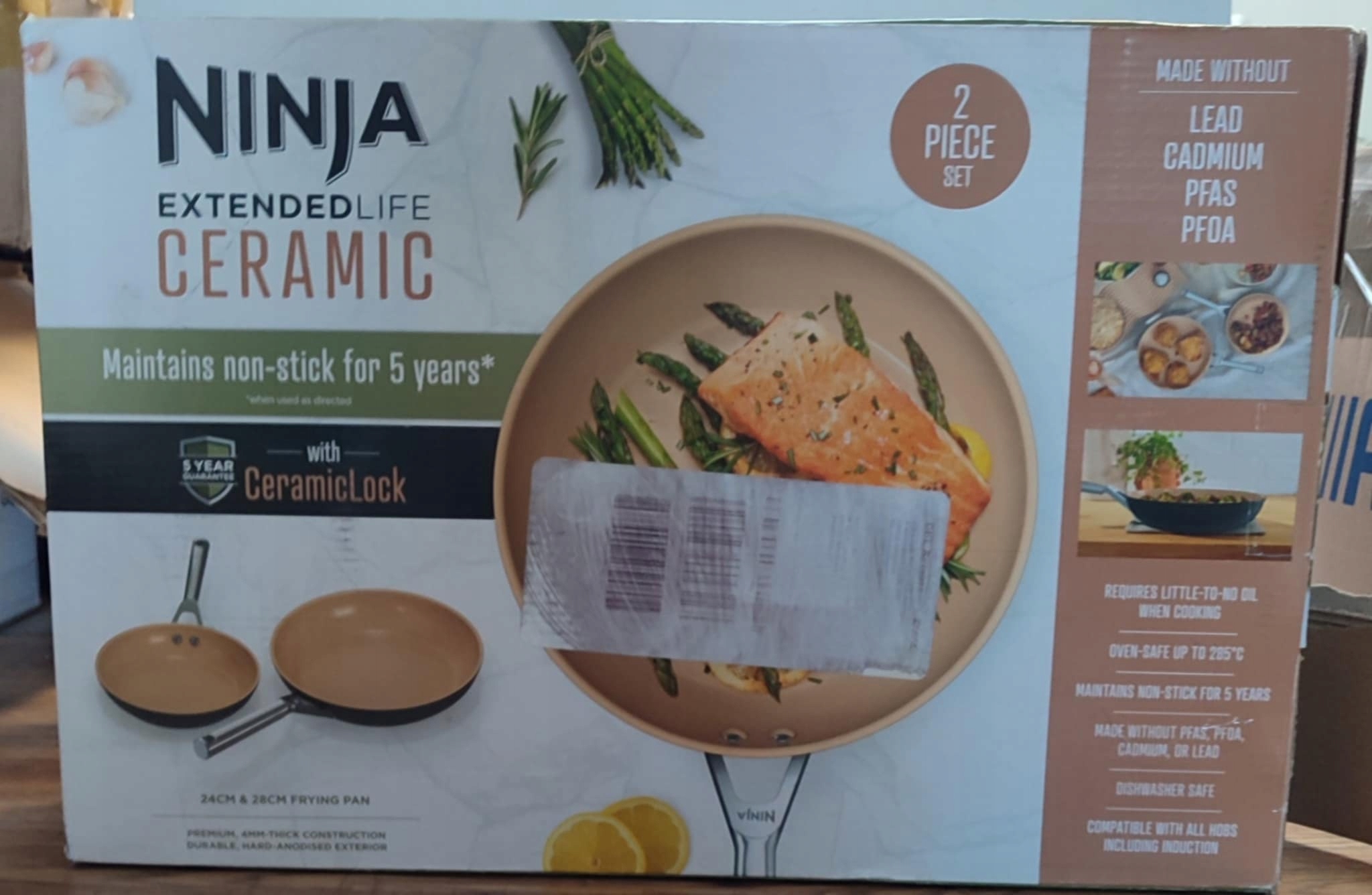 - название позиции: Ninja Extended Life Набор керамических сковород, состоящий из двух предметов (кастрюли диаметром 24 см и 28 см с крышками), с антипригарным покрытием (не содержит PFA, PFOA, свинца и кадмия), совместим с индукционной печью, безопасен.