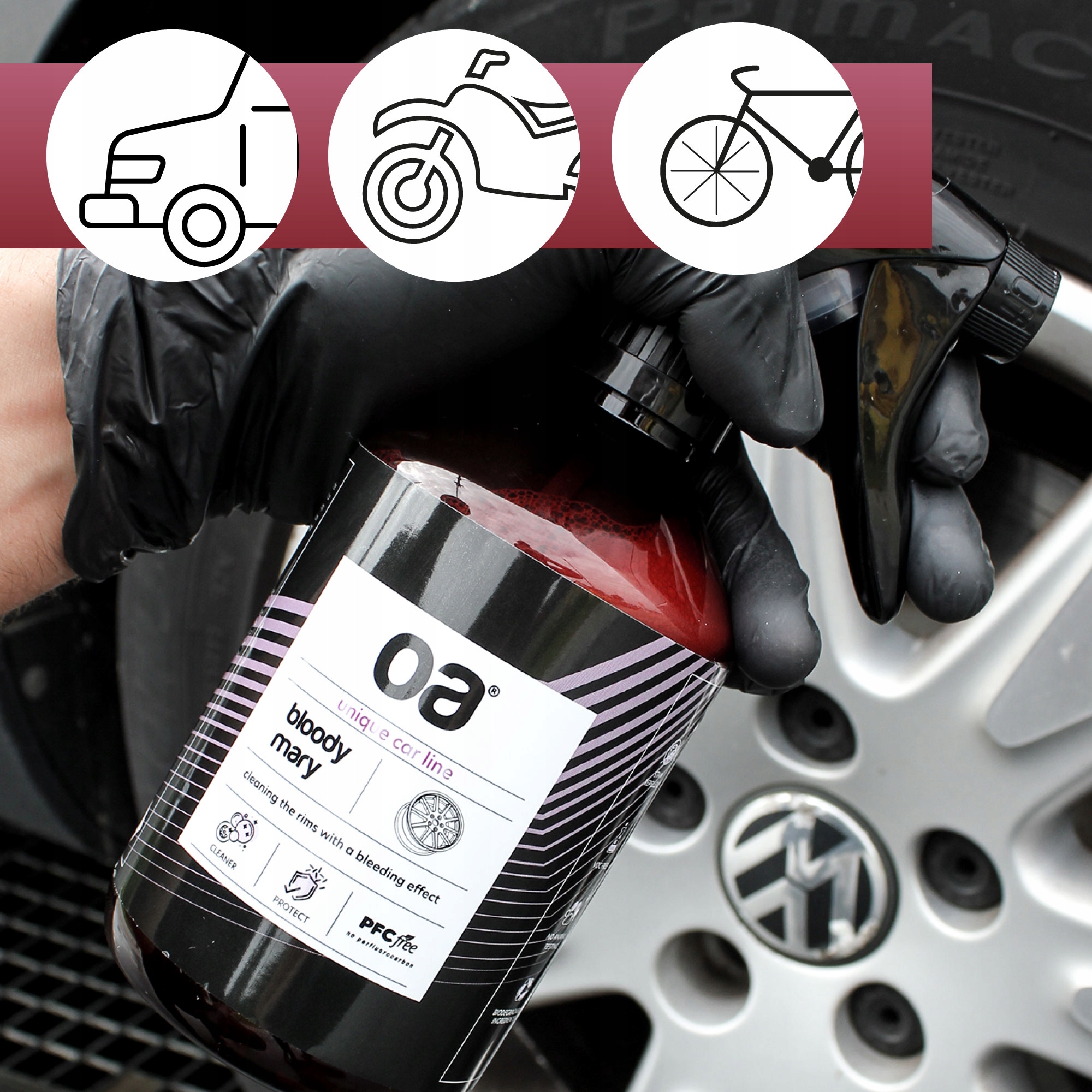 Познакомьтесь с профессиональным средством для тщательной очистки всех типов дисков и колпаков. OA CAR BLOODY MARY прекрасно справится со всеми металлическими примесями и может безопасно использоваться для автомобильных лакокрасочных покрытий. Препарат через 2 минуты обеспечивает немедленный эффект очистки без необходимости очистки. Возвращает первоначальный блеск дискам, не оставляя разводов и разводов. OA CAR BLOODY MARY, благодаря своей гелевой консистенции, дольше остается на очищенной поверхности, благодаря чему загрязнения более эффективно растворяются в результате химической реакции, в результате чего появляется характерный красный цвет. фиолетовый цвет – кровоточащий обод. Средство также можно использовать для удаления ржавчины и пятен ржавчины с брусчатки и бетона. Его также можно использовать для очистки металлических элементов колес велосипедов и мотоциклов.