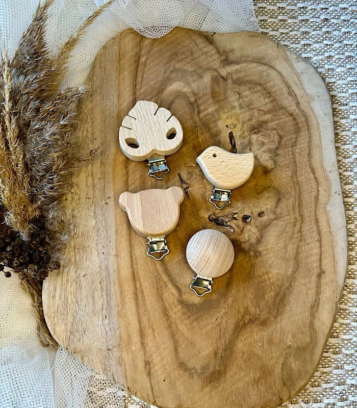 Возможность выбрать деревянную клипсу различной формы, например, мишка, птица, лист. или круг. Каждая клипса изготовлена из натурального дерева, что делает ее безопасным и стильным аксессуаром для вашего малыша.