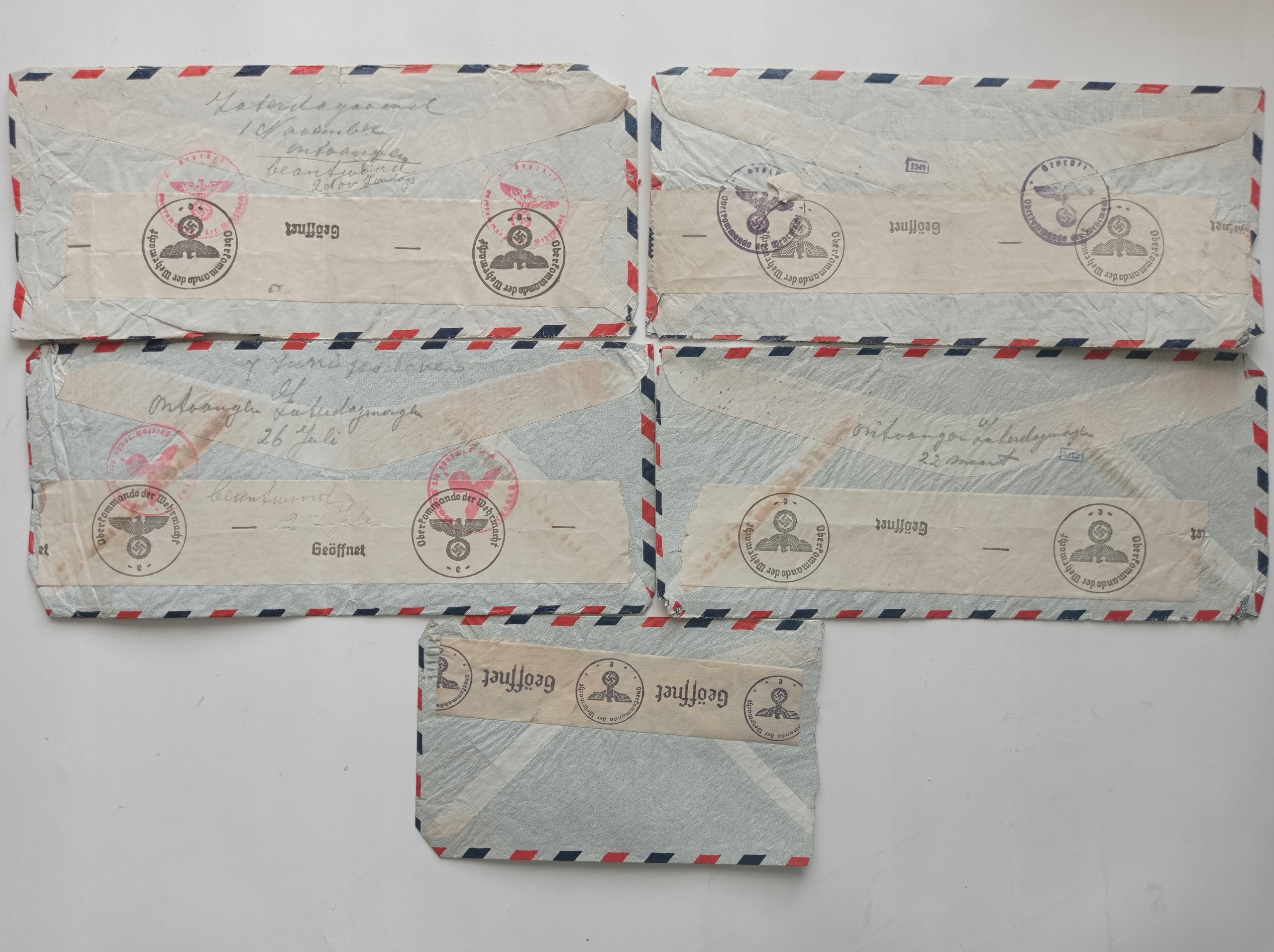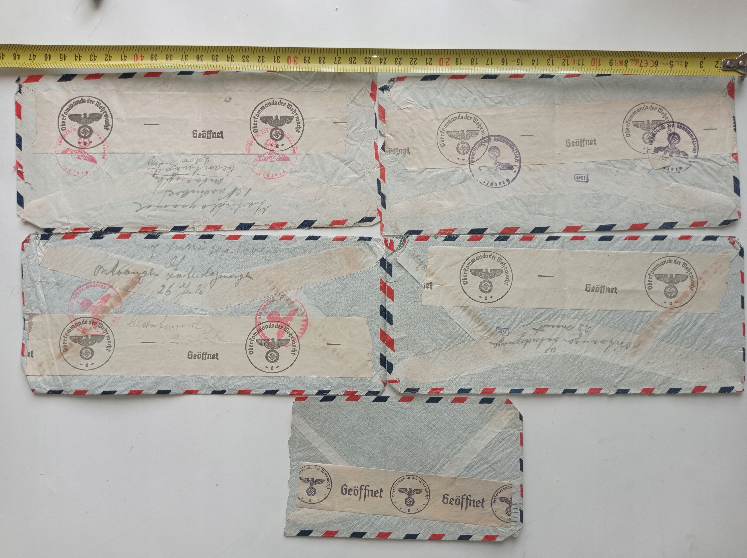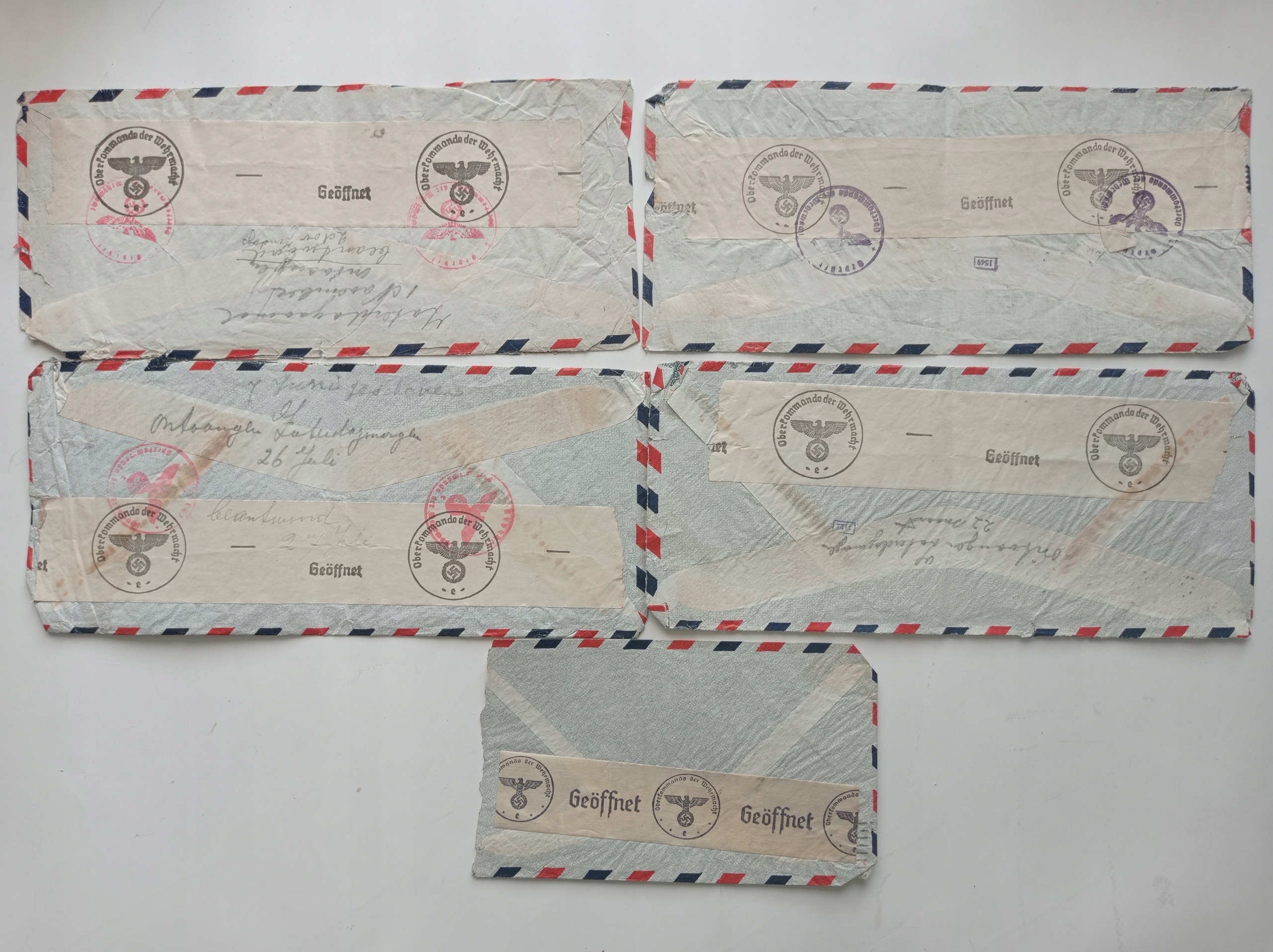 Предметом продажи являются 5 старых конвертов, видимых на фотографиях, адресованных из США в Нидерланды в 1940-41 годах с марками Верховного Главнокомандования Вооружённых Сил Третьего Рейха.
