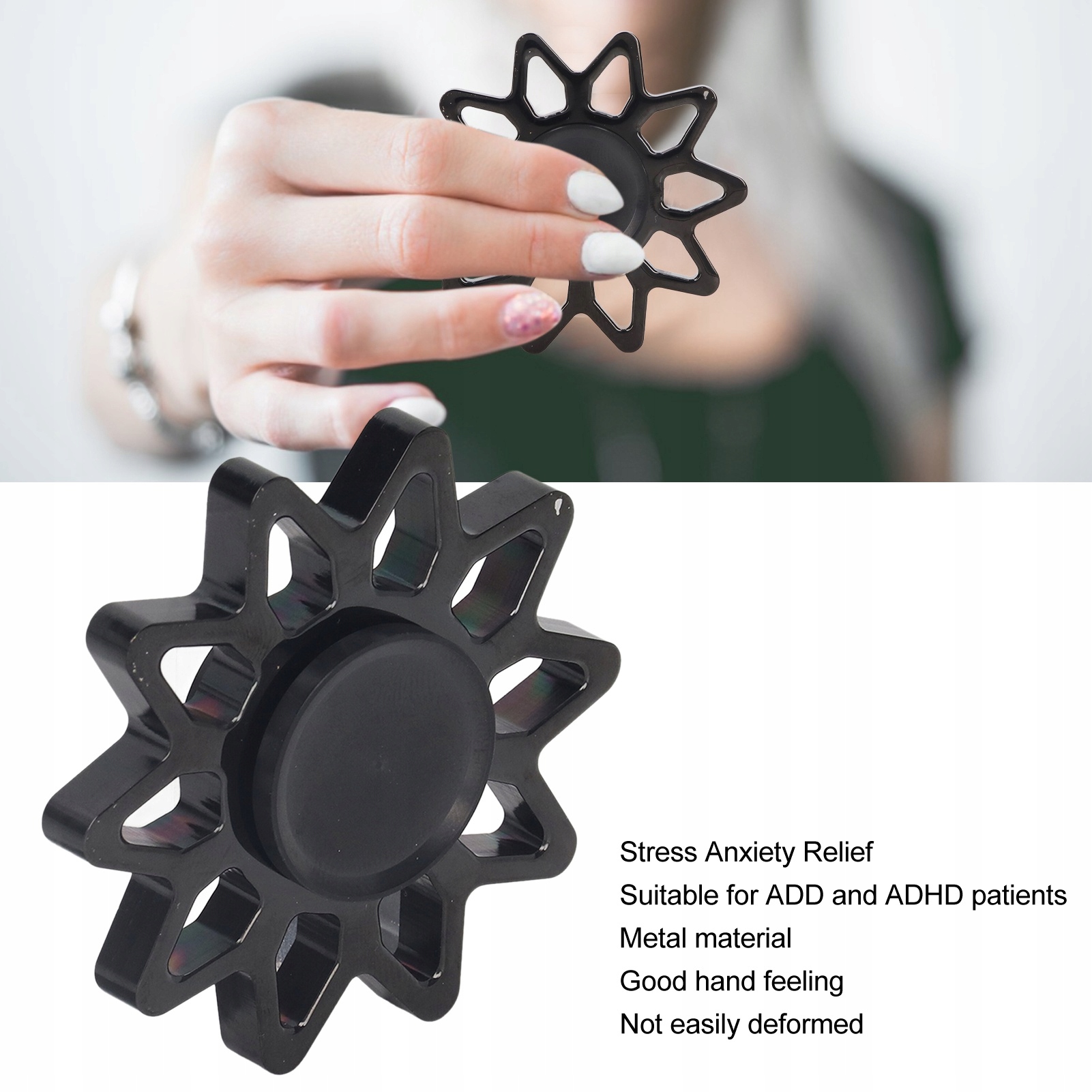 5. МЕТАЛЛ: Игрушка, вращающаяся на кончиках пальцев, изготовлена из прочного металлического материала, который нелегко сломать, он обладает хорошей механической прочностью, твердостью и устойчивостью к столкновениям.