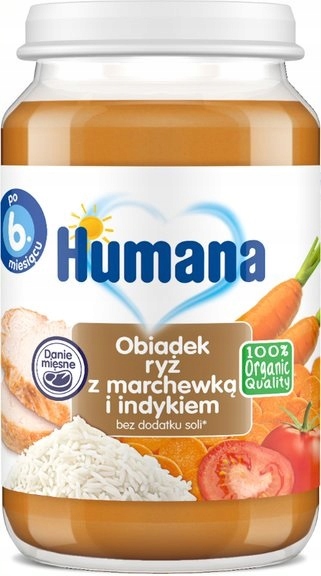 СВОЙСТВА ПРОДУКТА: Рис Humana Dinner с морковью и индейка – это 100% органическое качественное предложение для маленьких гурманов старше 6 месяцев, приготовленное из отборных ингредиентов высочайшего качества. Наш ароматный ужин из овощей с рисом и индейкой — идеальное блюдо, в котором ваш ребенок откроет для себя новые вкусы. Это полноценный обед. Продукт не содержит: