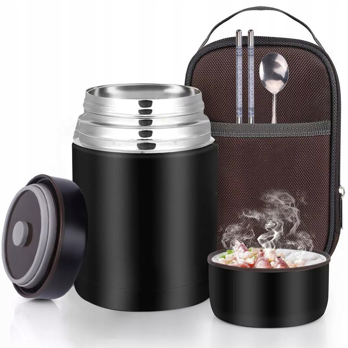 ✨Термальный контейнер для пищевых продуктов из нержавеющей стали 316, черный, 800 мл, двухслойный изолированный контейнер с крышкой, маленькая миска + ложка + палочки для еды + термосумка✨