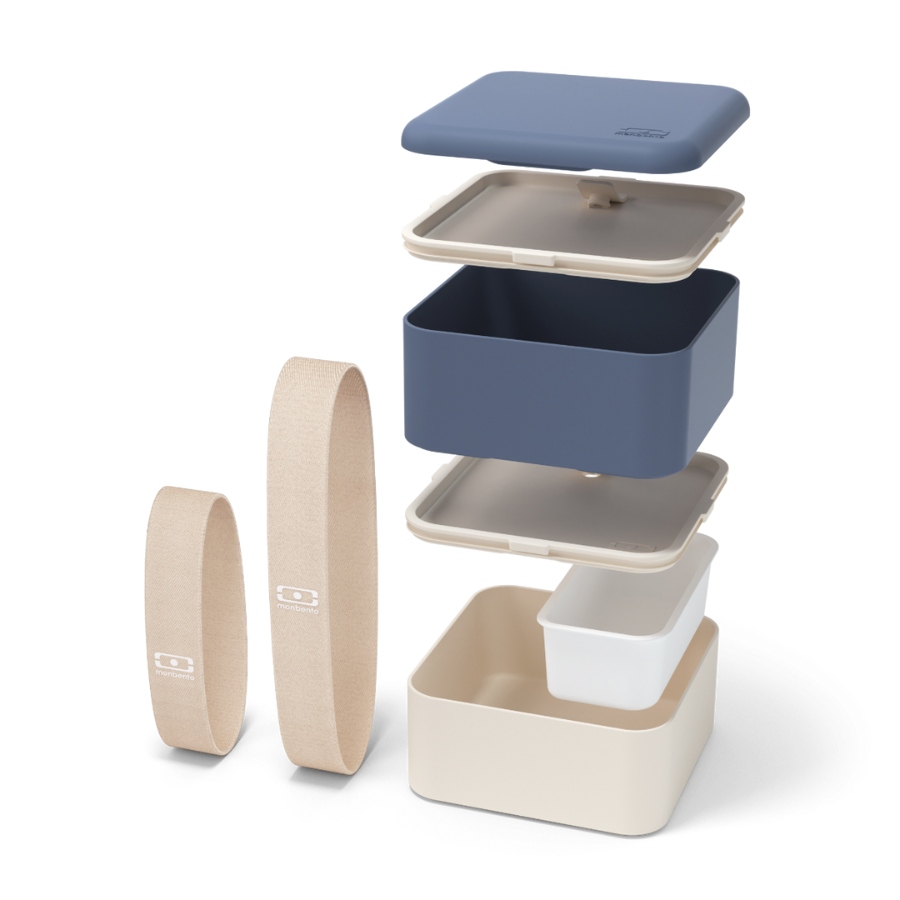 Обе коробки для ланч можно легко сложить друг на друга, а оригинальный гибкий ремень подключит их друг к другу. Если вы хотите взять только одну коробку, вам понадобится второй, более короткий ремень. Верхняя коробка все еще закрыта с крышкой, которую можно использовать для хранения столовых приборов Монбенто.