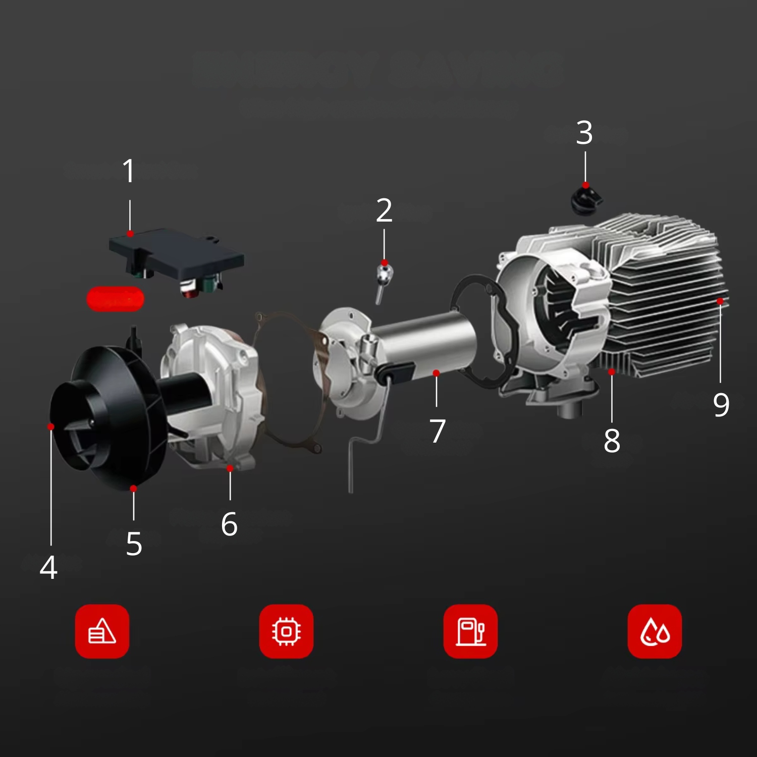 Камера сгорания, основание и масштаб тепла, изготовленные из песчаного алюминия. Этот дизельный парковочный обогреватель имеет интегральную структуру, характеризуется ровным тепловым рассеянием и высокой температурной сопротивлением