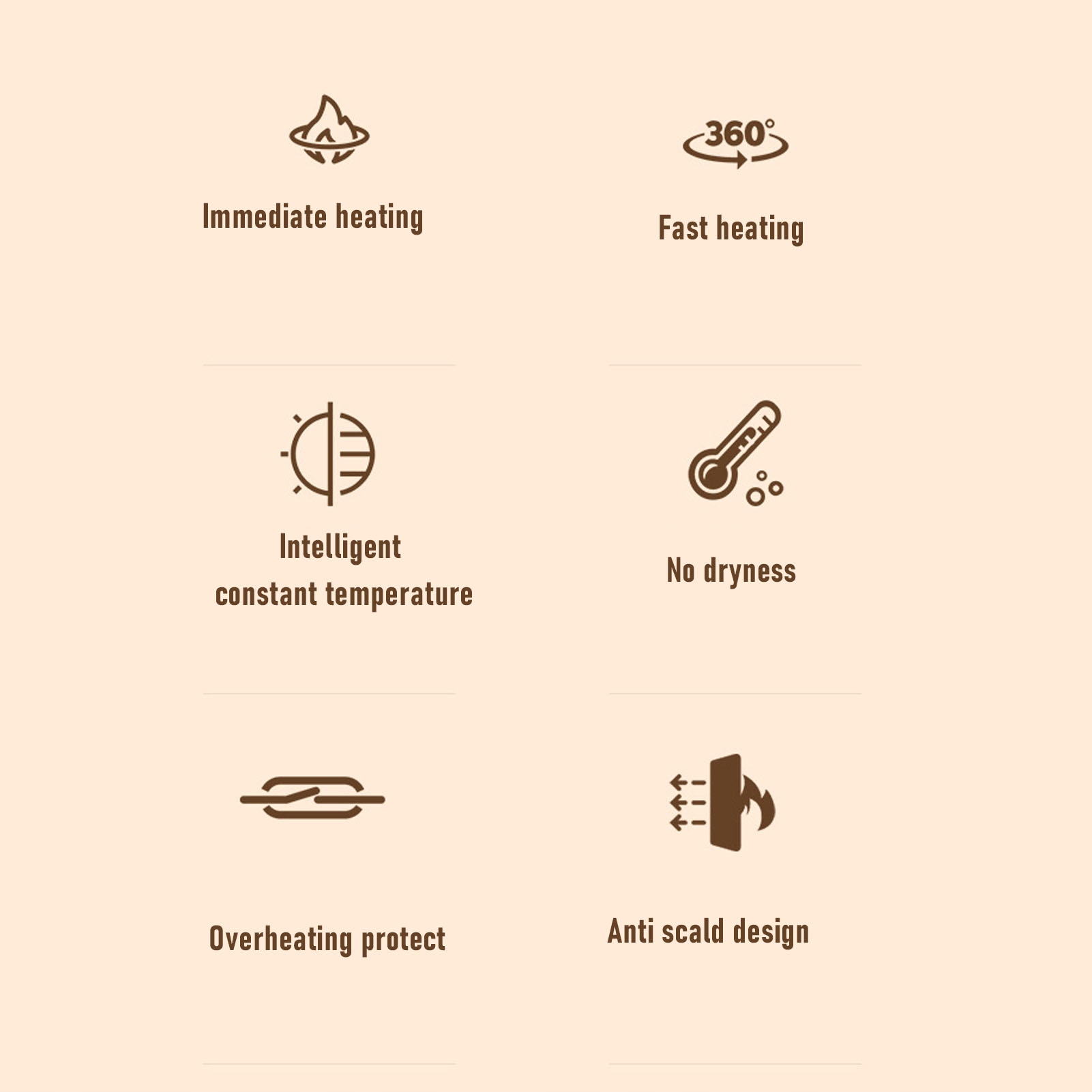 1. Быстрое отопление: электрический нагреватель обеспечивает быстрое и эффективное отопление, благодаря которой вы чувствуете теплую, интеллектуальную защиту перегрева, отключение источника питания и постоянную температуру предохранителя.