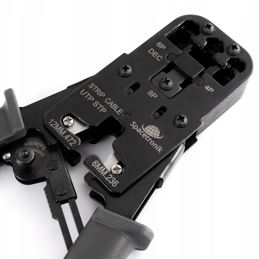 Высокая Качественный обжимной станок для кабелей RJ45, обеспечивающий точное обжатие концов Разъемы RJ-45, RJ-12 и RJ-11. Благодаря установленным лезвиям обжимной станок RJ45 Spacetronik NT-CT04 также позволяет снять изоляцию с кабеля и самого себя. резка. Противоскользящая ручка обеспечивает надежный захват, комфорт и безопасность. во время работы. Благодаря своей простоте и многофункциональности он выполнит ожидания любителей, профессиональных монтажников и профессионалов.