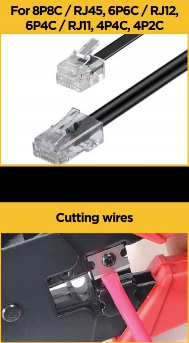 - Обжимные втулки: 8P8C/RJ-45, 6P6C/RJ-12, 6P4C/RJ-11; Вилки 4P4C, 4P2C.