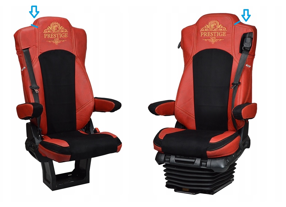 Примечание! Если у вас есть модель Mercedes Actros L с 2022 года, измерьте ширину подголовного труда у водителя и пассажира! Это должно быть измерено в местах, помеченных синим на фотографии - от швов! И напишите нам сообщение с этими измерениями. Два типа мест установлены для этой модели автомобиля. На этом аукционе вы покупаете крышки для кресла с шириной подголовника 8 см!