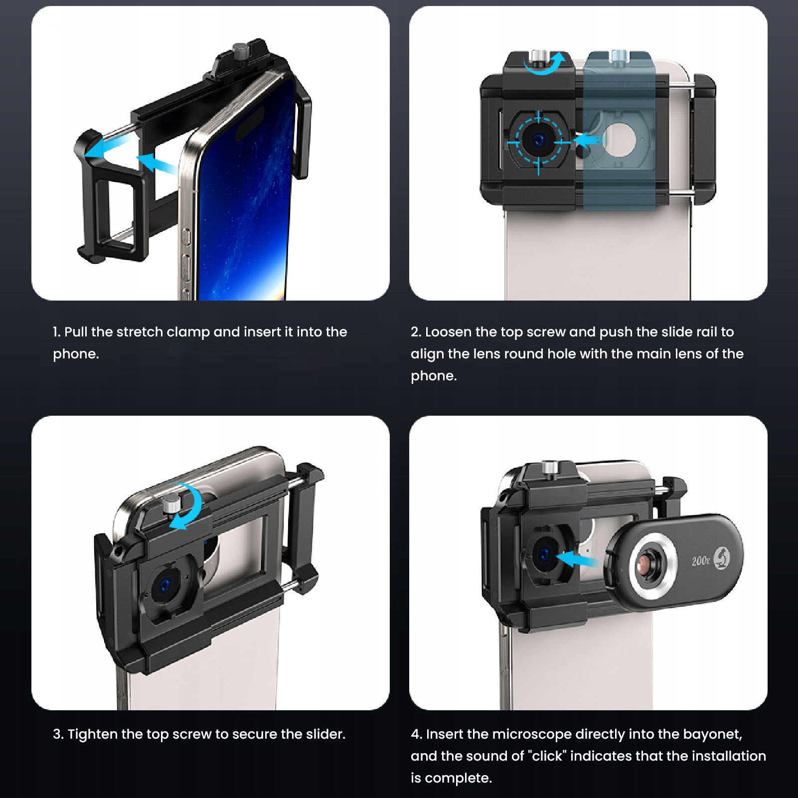 1. Удобное использование: изменить смартфон в микроскоп, предлагая увеличение 200x для четких и живых изображений. Сдвиг и дизайн скромности позволяет быстро переключаться. Оптимальное расстояние работы между объективом и объектом составляет от 6 до 10 мм.