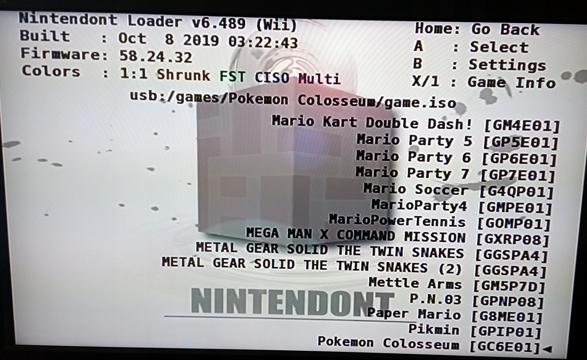 Игры Nintendo Gamecube:100 Avalanche, Alin Hominid, Baten Kaitos, Eternal Wings and the Lost Ocean, Baten Kaitos Origins, Beyond Good & Evil, Bloody Roar Primal Fury, Crash Bandicoot Wrath of Cortex, Digimon Rumble Arena 2, Digimon World 4, Eternal Darkness, Fire Emblem Path of Radiance, F-Zero GX, Harvest Moon A Wonderful Life, Ikaruga, Kirby Air Ride, Lost Kingdoms, Lost Kingdoms II, Особняк Луиджи, Mario Kart Double Dash!, Mario Party 4, Mario Party 5, Mario Party 6, Mario Party 7, Mario Power Tennis, Mario Smash Football, Mega Man Миссия X Command, Metal Arms Glitch in the System, Metal Gear Solid Twin Snakes, P.N.03, Paper Mario, Pikmin, Pokemon Colosseum, Pokemon XD Gale of Darkness, Resident Evil, Resident Evil 2, Resident Evil 3 Nemesis, Resident Evil Zero, Resident Evil Code Veronica Wars Rogue Squadron III Rebel Strike, Super Paper Mario, Super Smash Bros. Ближний бой, Tales of Symphonia, Viewtiful Joe, Virtua Quest, Wario World, WarioWare Inc Mega Party Game, Wave Race Blue Storm, Zelda Four Swords Adventures, Zelda Wind Waker, Zelda Ocarina of Time и Master Quest