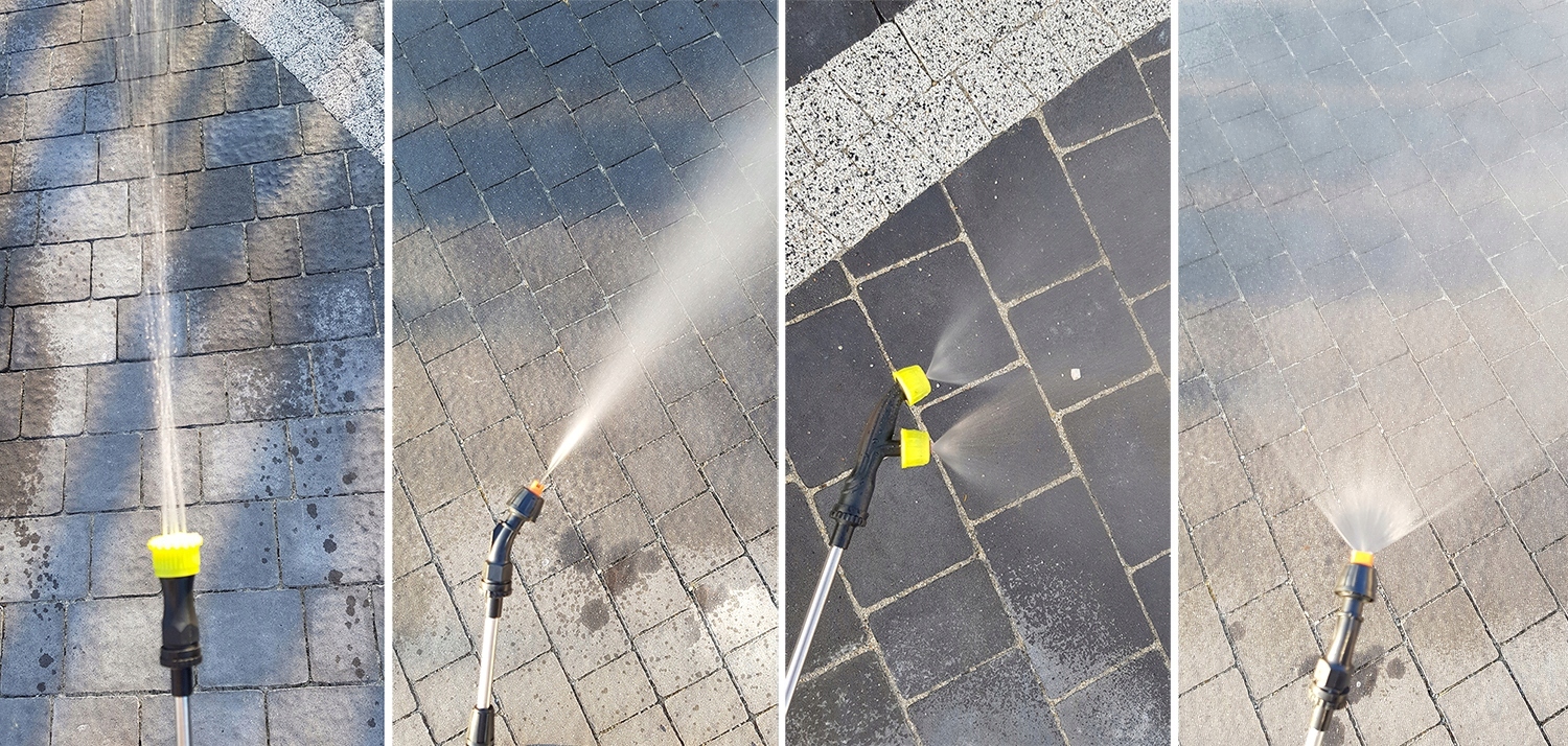 Насадка ГЕРАБИЦИДА хорошо работает при опрыскивании, например, высолов брусчатки вблизи кустов