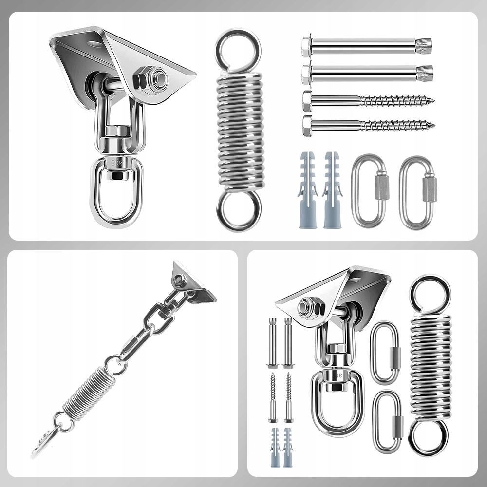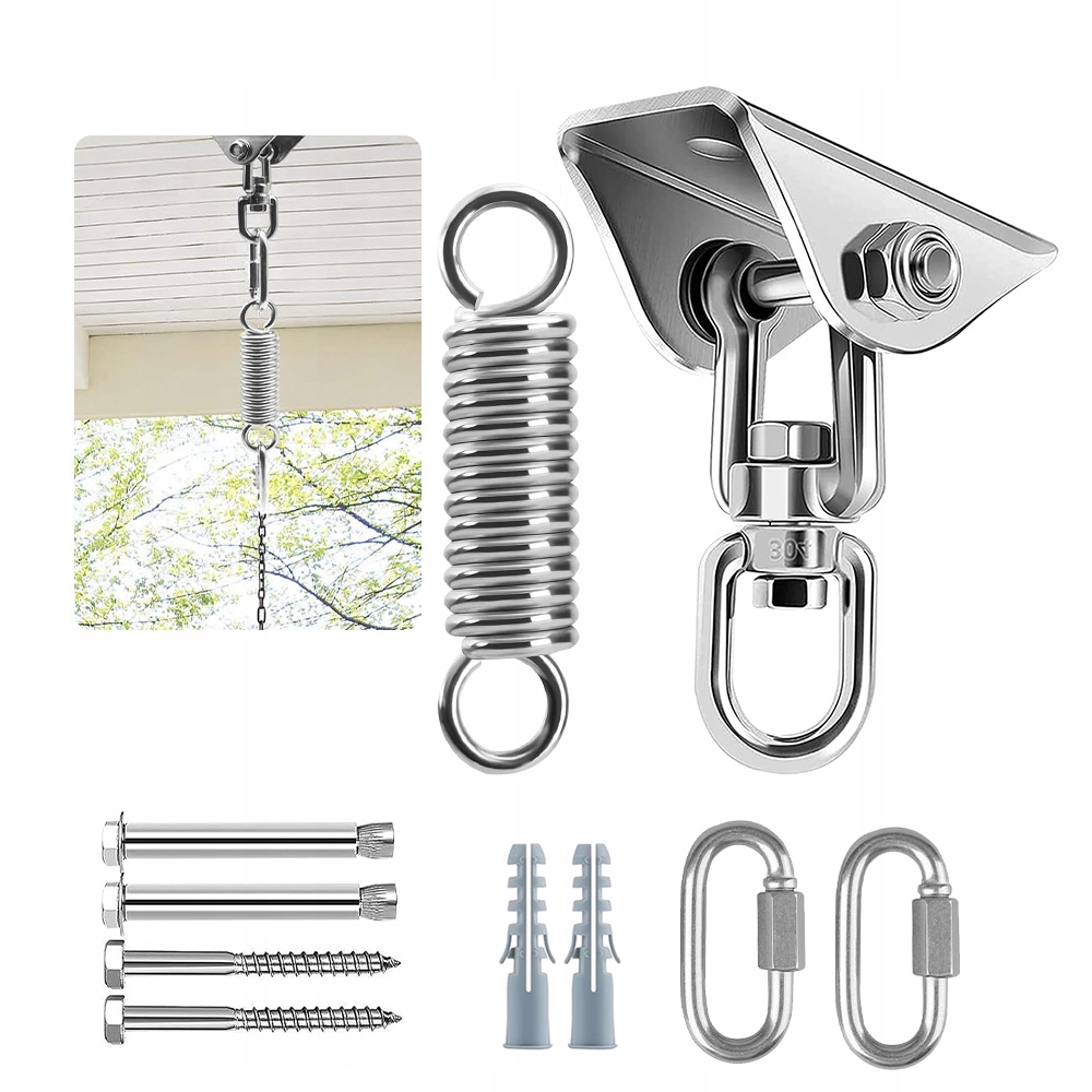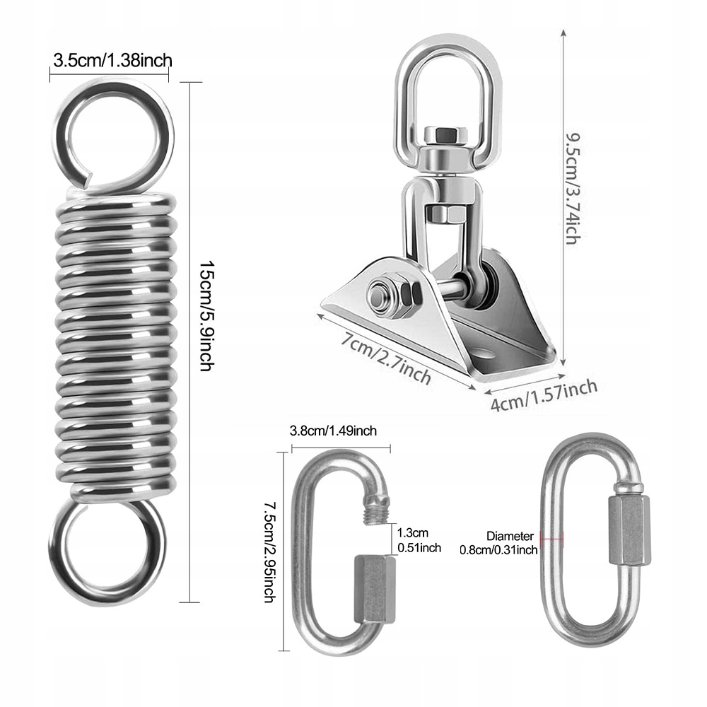 Все детали изготовлены из высококачественного сырья из нержавеющей стали 304. Антикоррозионная, достаточно устойчивая к коррозии, высокая твердость, обеспечивающая безопасное использование. Соединение монтажной пластины из нержавеющей стали имеет слой рулонного нейлонового материала снаружи, чтобы гарантировать отсутствие металлического трения во время использования. Это безопасный и надежный выбор для подвешивания качелей или гамака на открытом воздухе или в помещении.