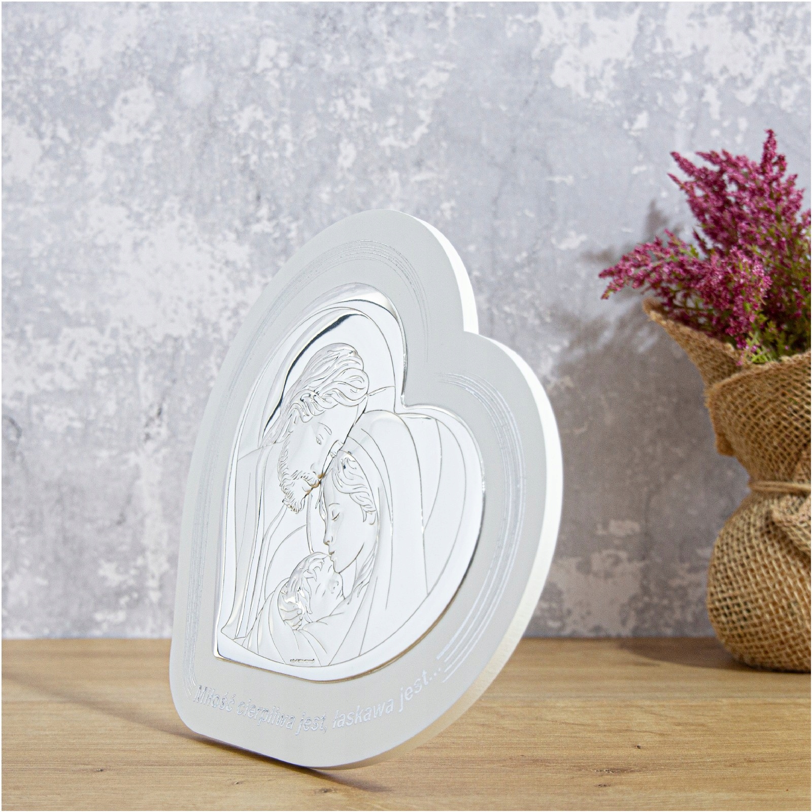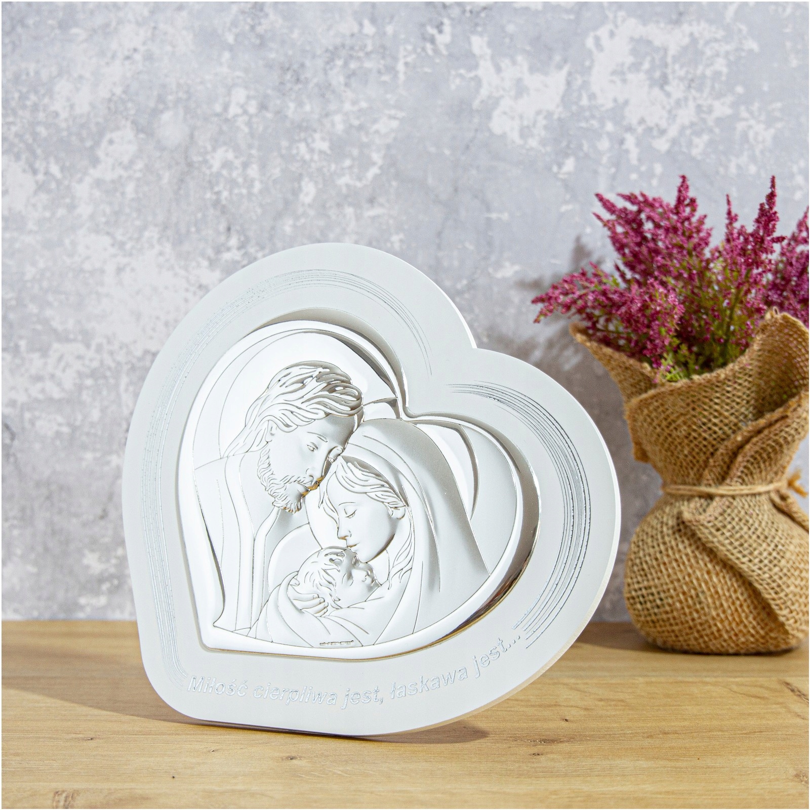 Картина с изображением Святого Семейства в форме сердца на белом дереве - прекрасный подарок на Крещение, Венчание, Первое Святое Причастие, юбилей. Качественное исполнение, изысканная отделка, элегантная упаковка - все это создает уникальный сувенир на долгие годы... Картина еще и чрезвычайно практична: у нее есть встроенная подставка, поэтому ее можно разместить на шкафу или комоде. или повесьте его на стену.