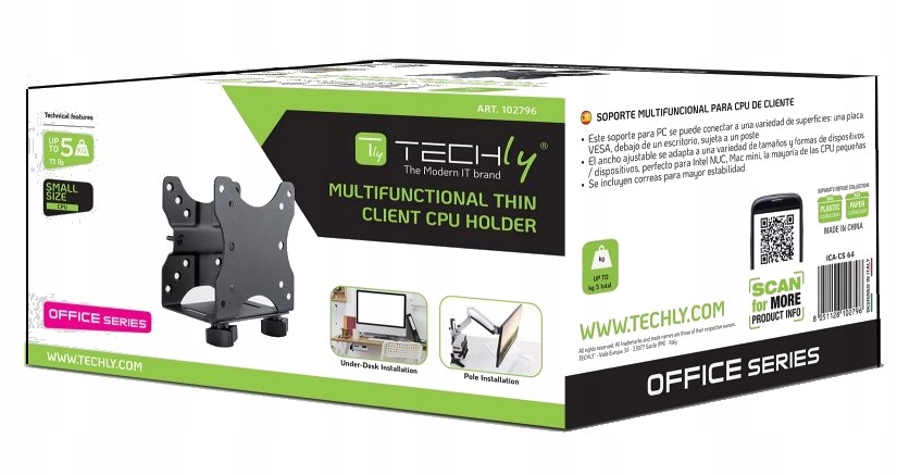 благодаря универсальной ручке микрокомпьютера Techly ICA-CS 64 размещение mini PC в удобном и доступном месте раньше никогда не было так проще. Ручка предлагает три варианта сборки. Первое - это установка vesa 75x75 или vesa 100x100 - ручка установлена между VESA к монитору и самому монитору, благодаря которой мини -компьютер в основном невидим. Второй способ - установить верхнюю часть Desk - ручка может быть привинчен как к горизонтальным, так и к вертикальным столовым верхам, поэтому эстетика и аккуратность рабочего места сохраняются. Последний, третий путь - это сборка для пряжки к полюсу вертикального монитора, благодаря которой мы получаем быстрый и удобный доступа к портам микрокомпьютер. Чтобы обеспечить безопасность, набор был оснащен увеличивающейся лентой стабильности установленного компьютера.