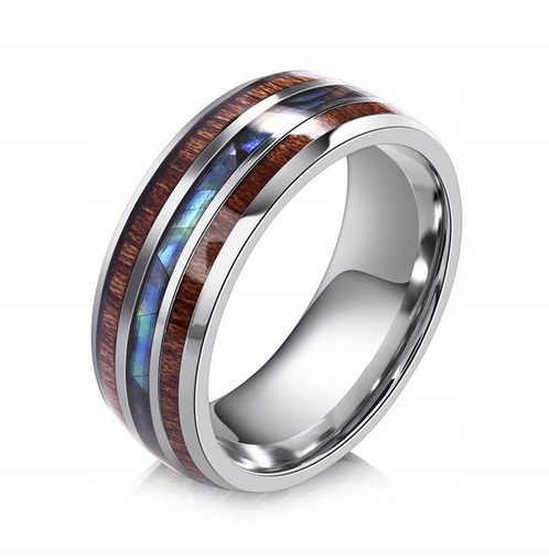 Красивое обручальное кольцо из дерева и раковины морского ушка.