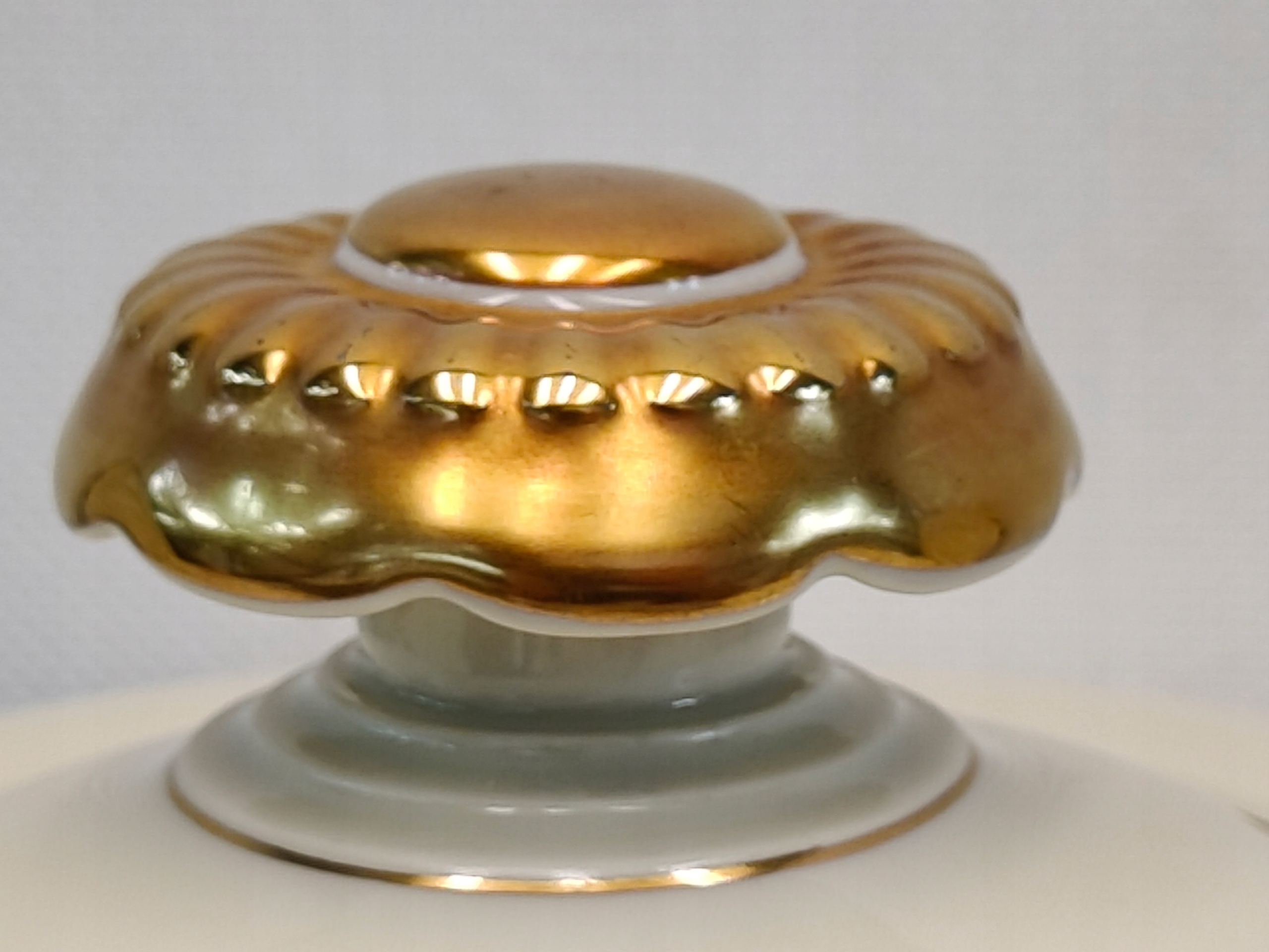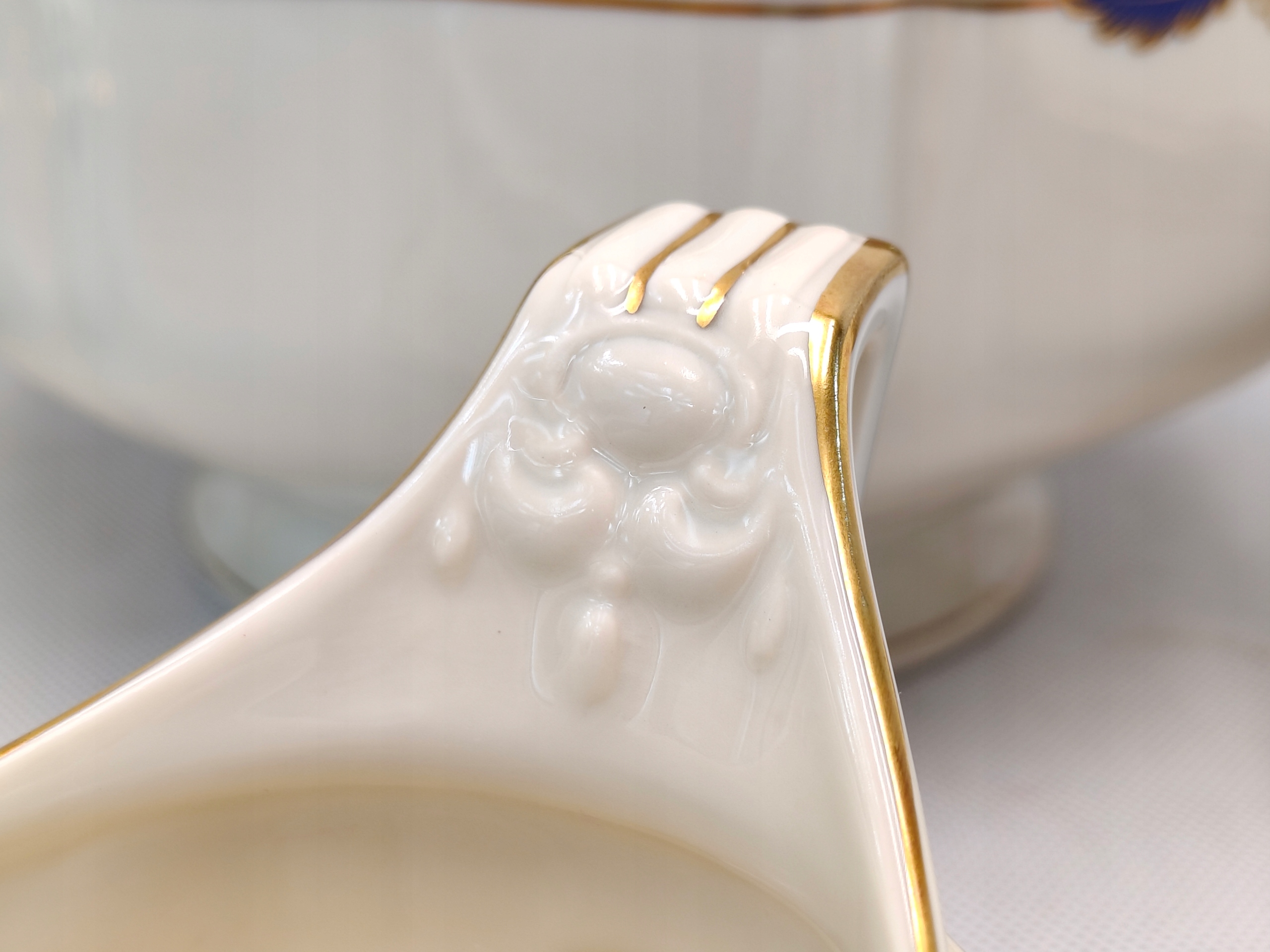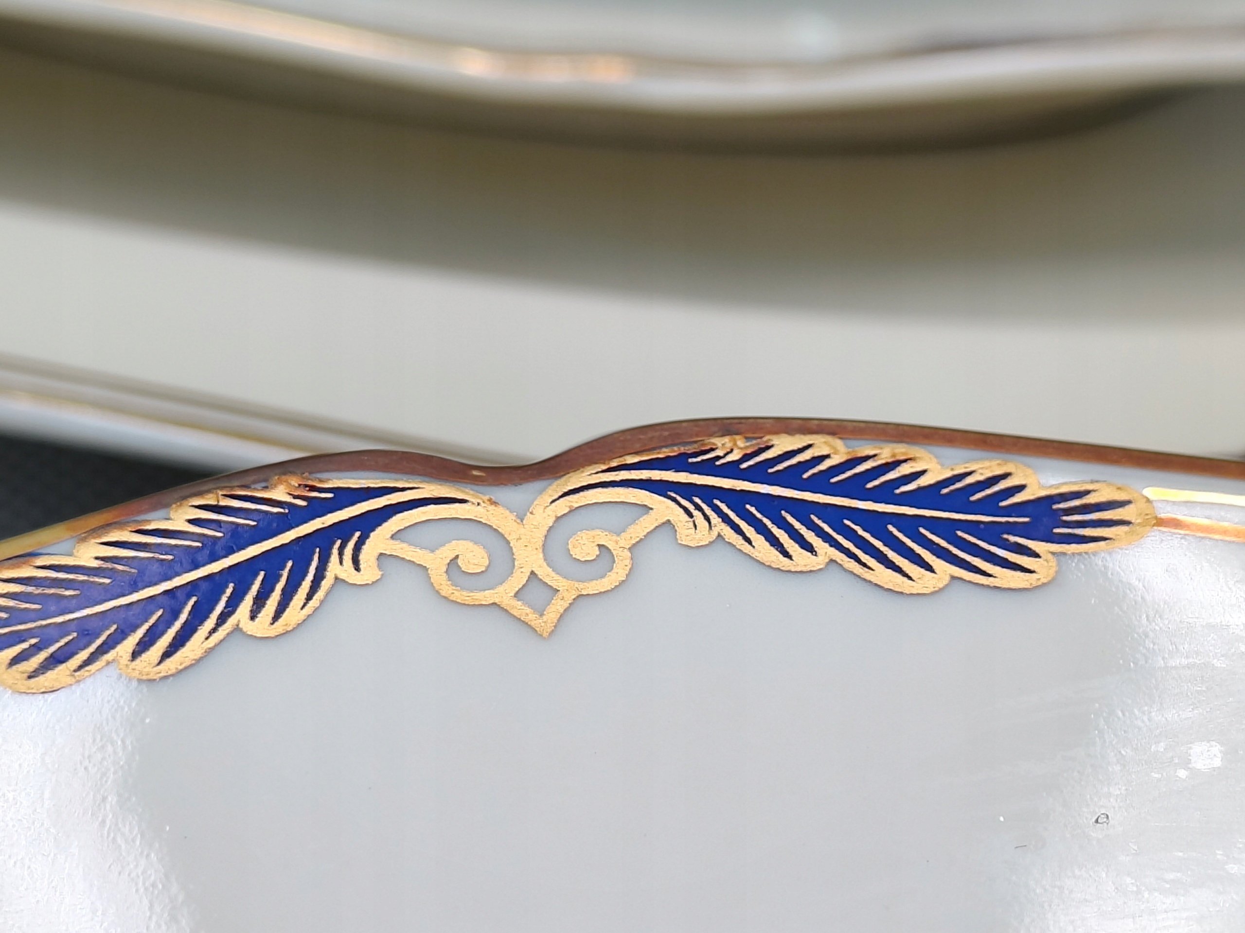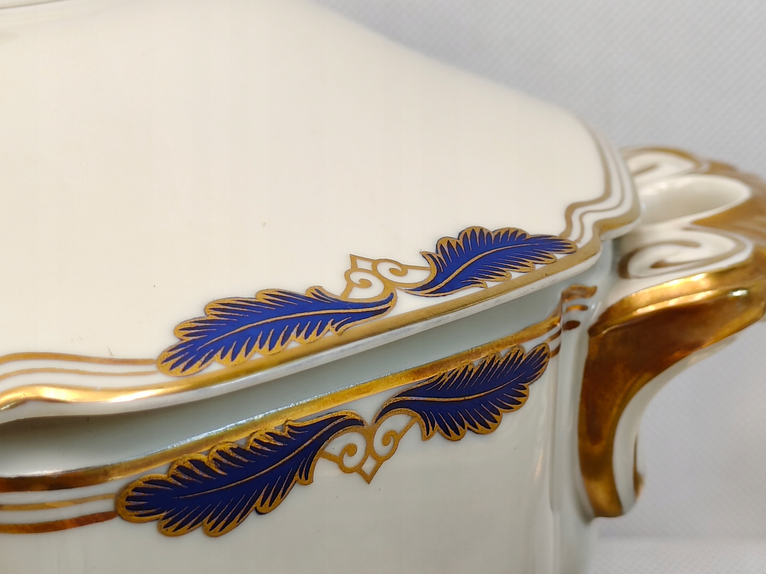 Post -war Top -Class фарфор в слоновой кости с богатым золотым украшением и листьями кобальта.