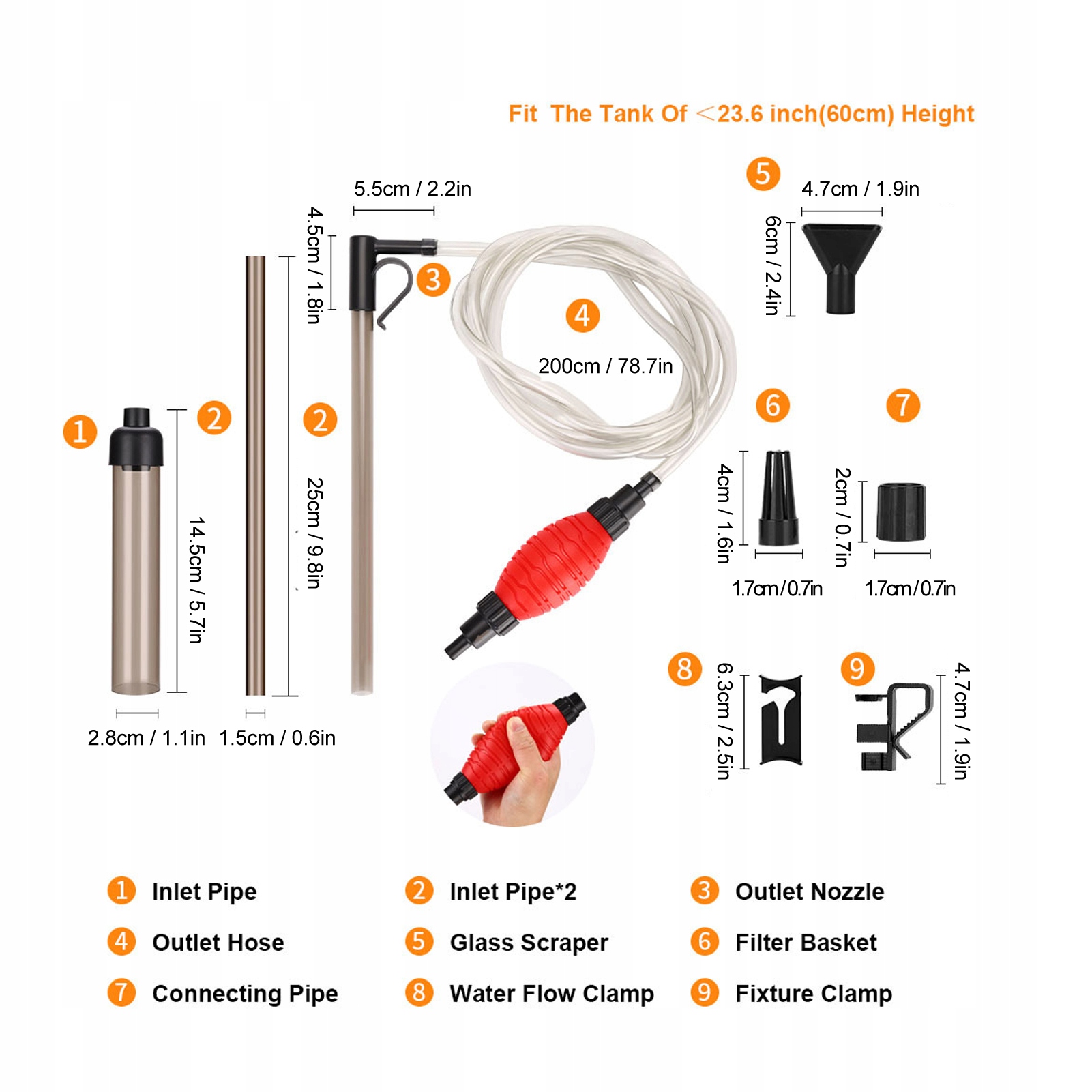 1. Очищение в вакууме: очистка вакуумного очистителя аквариума оснащена вакуумной трубкой, можно использовать скорость потока 110 GPH для быстрого изменения воды и очистки гравия и песка.