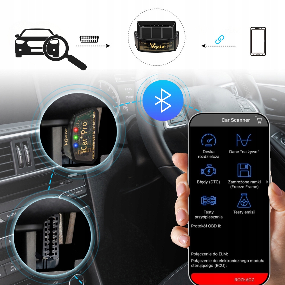 - Подключите интерфейс к OBD-порту в автомобиле, подключите устройство к соответствующему приложению и все! (подробная пошаговая инструкция на польском языке прилагается к устройству)