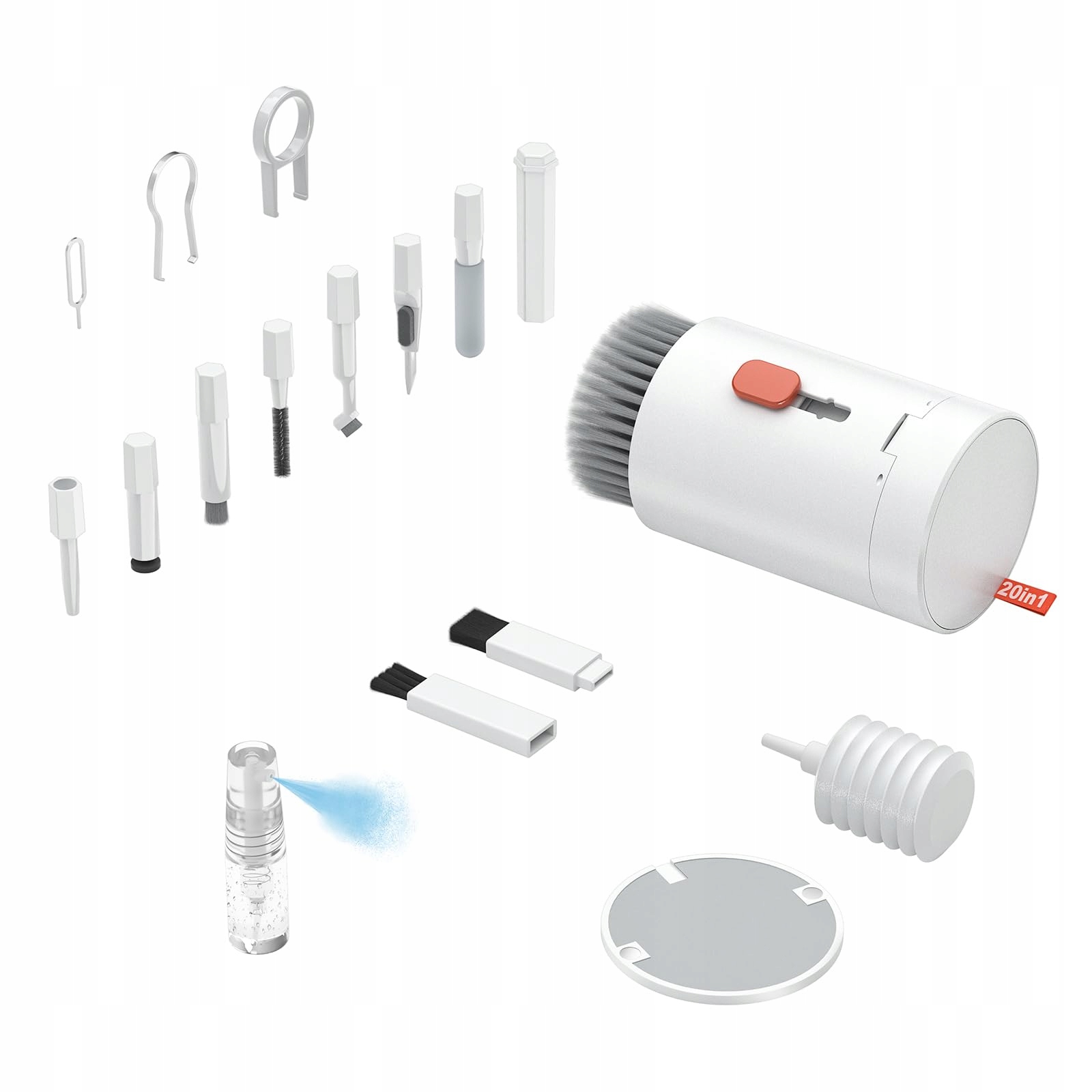 20W1 Комплект для очистки оснащен 20 различными инструментами, которые обеспечивают комплексную помощь вашим устройствам. В нем вы найдете элементы, предназначенные как для экранов, так и для клавиатур или наушников, обеспечивающих эффективность в любой ситуации. Независимо от того, нужно ли вам тщательно удалить пыль из ключей или осторожно вытереть экран - в этом наборе есть все необходимое.