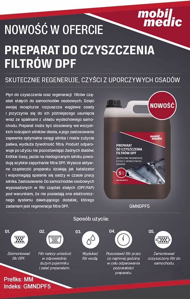 Жидкость для очистки и регенерации сажевых фильтров легковых автомобилей. Благодаря своему рецепту растворяет нагар и способствует его последующему удалению вместе с выхлопными газами из выхлопной системы автомобиля. Препарат можно использовать во всех типах дизельных двигателей, его применение обеспечивает оптимальную работу двигателя и низкий расход топлива, а также продлевает срок службы DPF-фильтра. Продукт испаряется после использования, не оставляя следов. Короткие маршруты, езда на недогретом двигателе приводят к быстрому засорению фильтра DPF. Высокоактивные частицы препарата действуют как катализатор и поддерживают горение сажи во время работы двигателя.