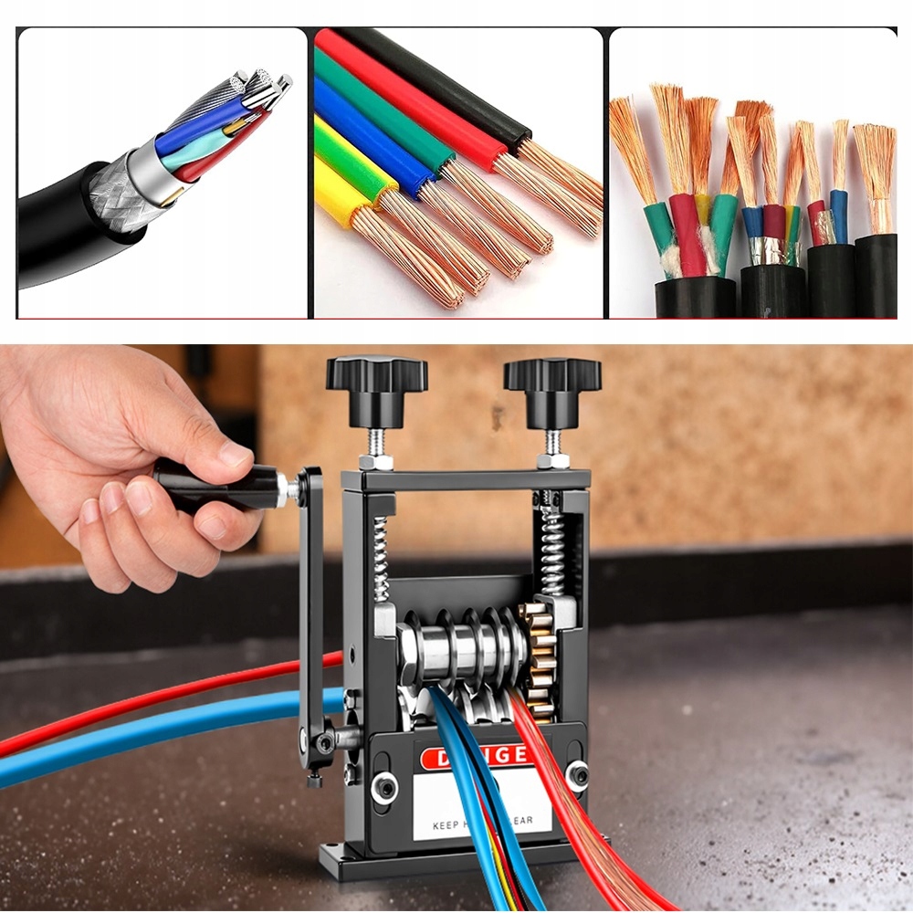 🗃️Используйте кнопку, чтобы установить желаемую высоту лезвия, Протяните кабель через соответствующее отверстие, затем поверните рукоятку или подсоедините дрель, чтобы снять изоляцию. изоляция.