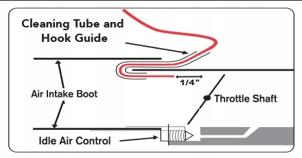 3.) С помощью крюка направляющая и очистительная трубка, расположенная в корпусе дроссельной заслонки, поместите кончик трубки сопла на 1 см перед дроссельной заслонкой там, где дроссельная заслонка открывается от сопла.