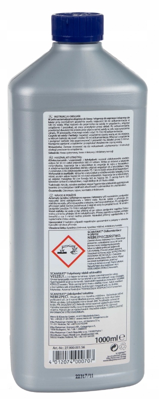 Жидкость Scanpart разбавляется водой для получения раствора для удаления накипи. Пропорции использования средства для удаления накипи и воды зависят от производителя и типа кофемашины. Лучше всего следовать информации, содержащейся в руководстве пользователя кофемашины. Перед удалением накипи из машины извлеките фильтр из резервуара для воды.