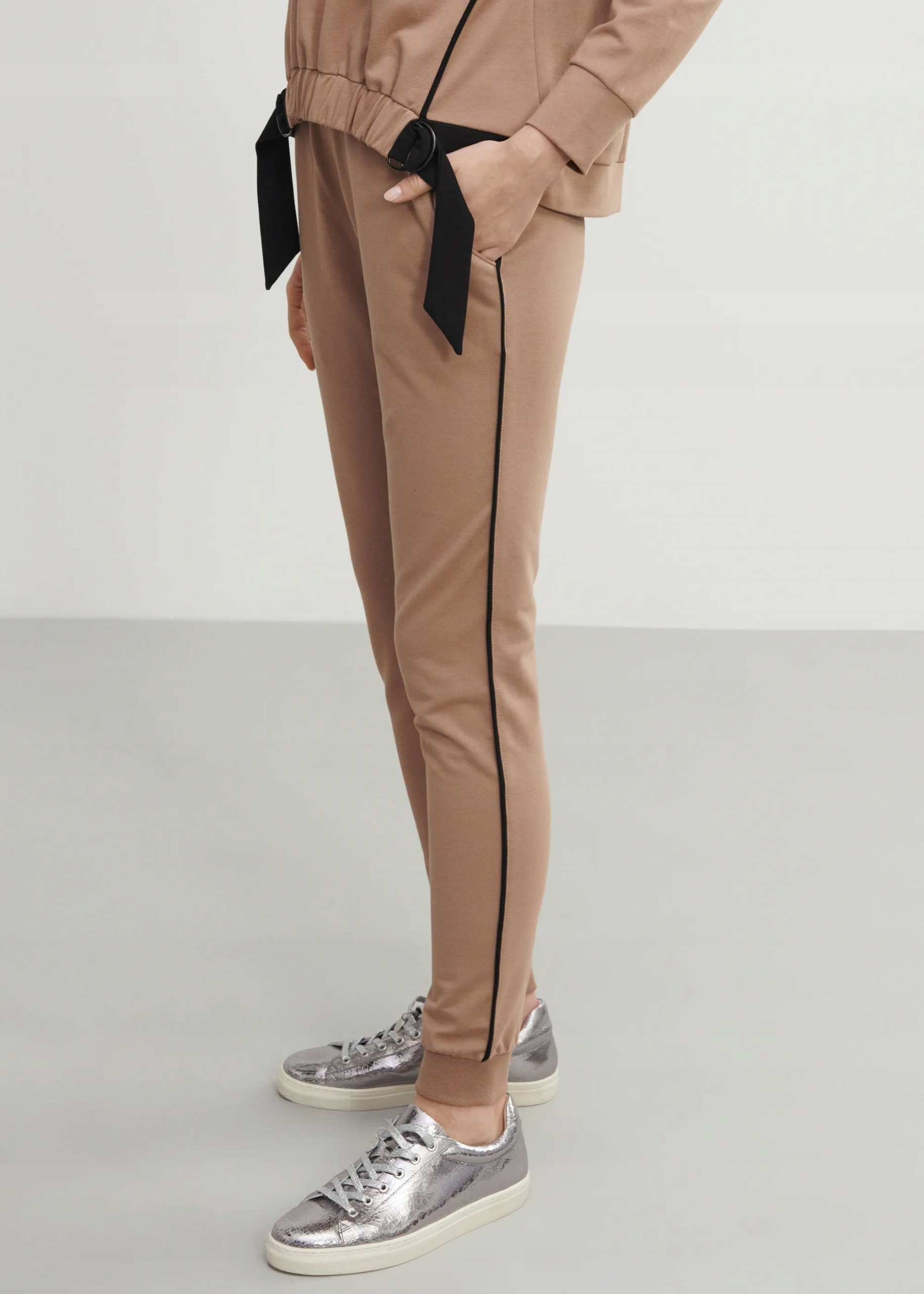 Женские спортивные штаны темно-бежевого цвета. Изготовлен изхлопка с добавлением эластана. Приобретение гарантирует возможность создания как повседневного, так и слегка спортивного стиля.