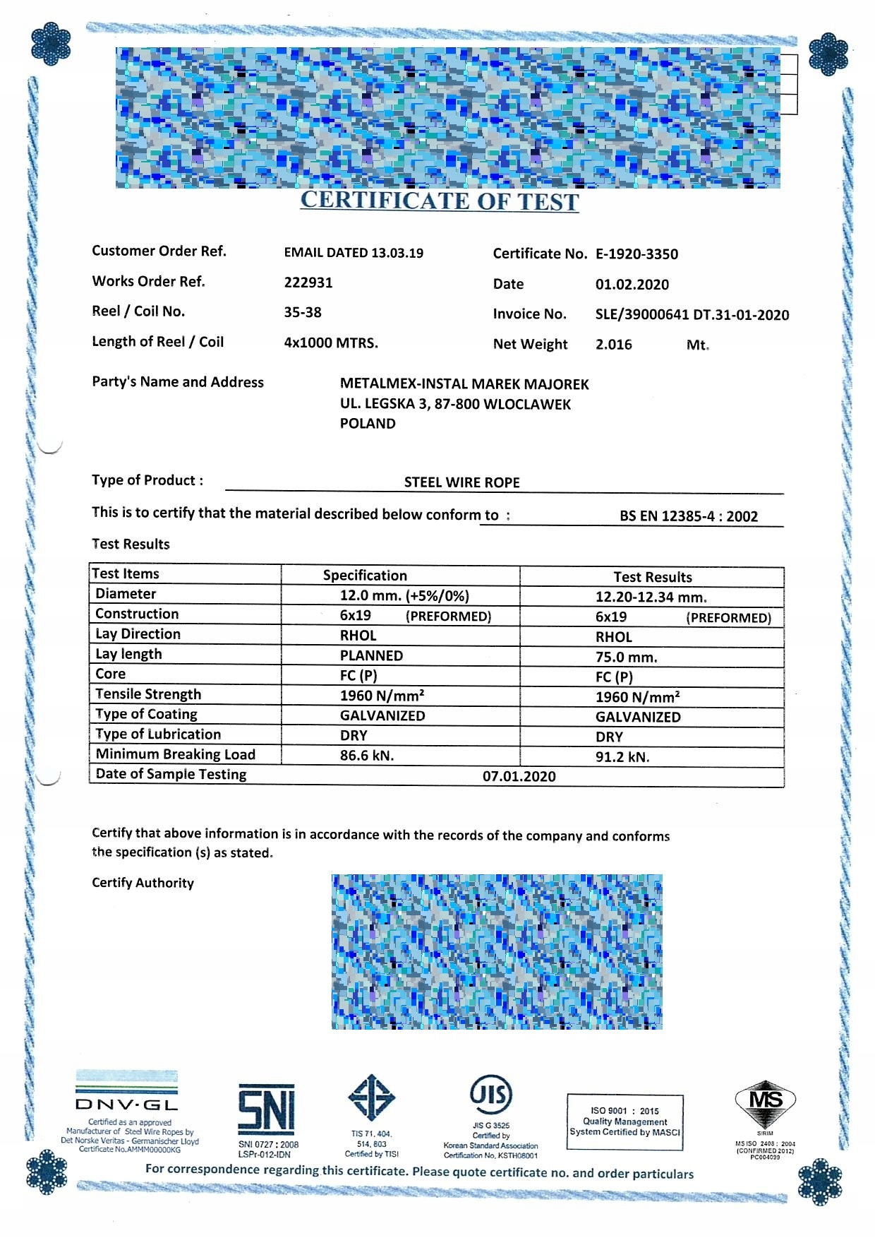 Канаты имеют сертификат производителя (как на фото), что дает уверенность в том, что они изготовлены в соответствии с немецкими и европейскими стандартами DIN 3064, BS EN 12385-4:2002.