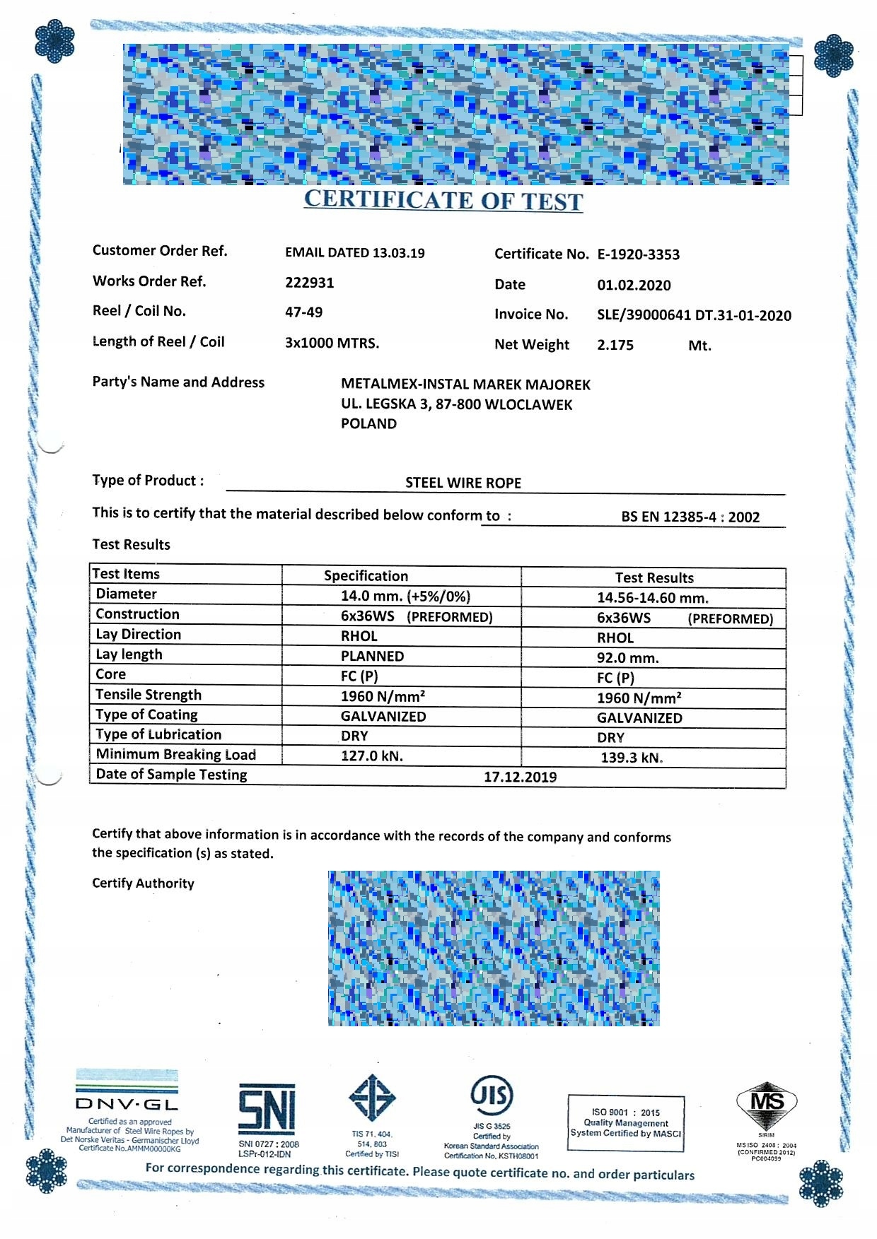 Канаты имеют сертификат производителя (как на фото), что дает уверенность в том, что они изготовлены в соответствии с немецкими и европейскими стандартами DIN 3064, BS EN 12385-4:2002.
