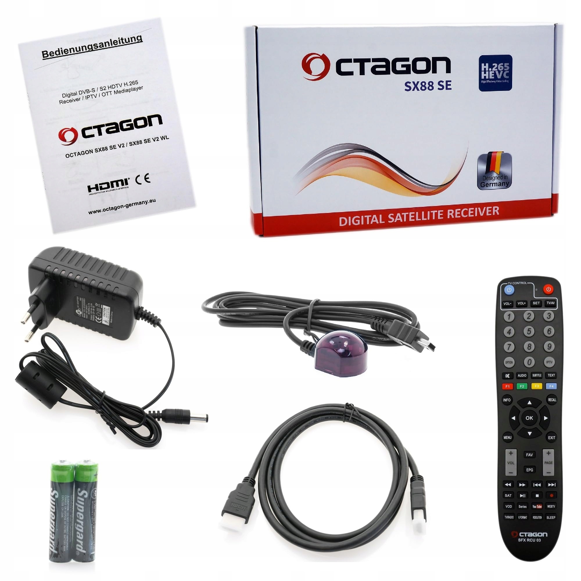 Компоненты в комплекте: кабель HDMI, спутниковый ресивер OCTAGON SX88 SE V2 HD H.265 S2+IP, пульт дистанционного управления 2-в-1, блок питания, 2 аккумулятора, кабель HDMI, инфракрасный кабель, руководство пользователя (на немецком и английском языках).